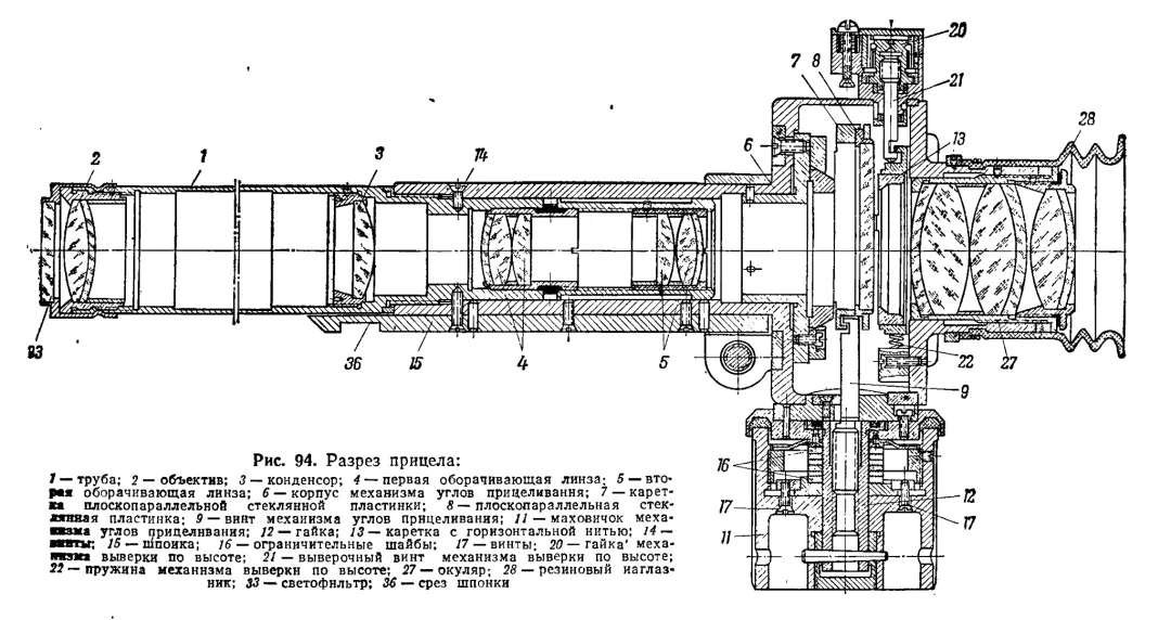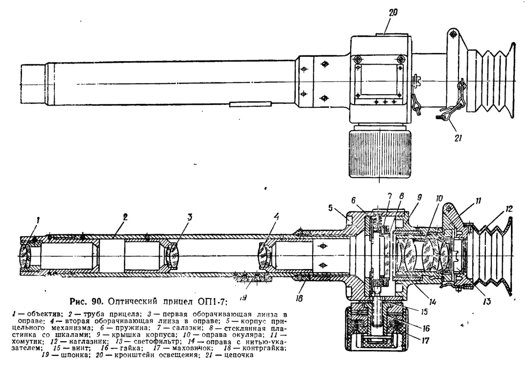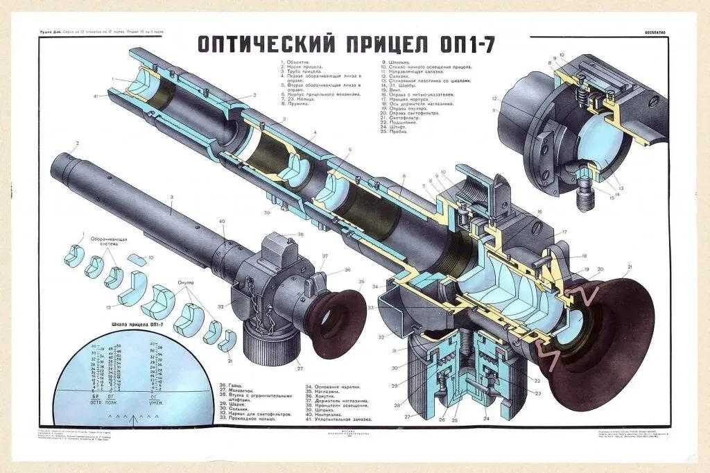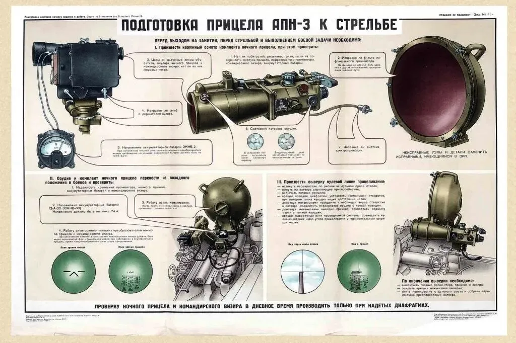 在进一步的研究深入之前,关于这款瞄准镜的细节尚知之甚少。它采用单片 S-1 光电阴极(苏联文献中仅记载了 Ag-O-Cs 光电阴极),要实现有效射击,必须依赖大型红外探照灯的照明。根据该瞄准镜的技术手册,在红外照明下,其视距可达 800 米。这主要是得益于该瞄准镜的高放大倍率以及作为第一代(Gen 1)设备相较于二战时期如 FG1250(Gen 0,视距仅 400 米)显著提升的增益效果。