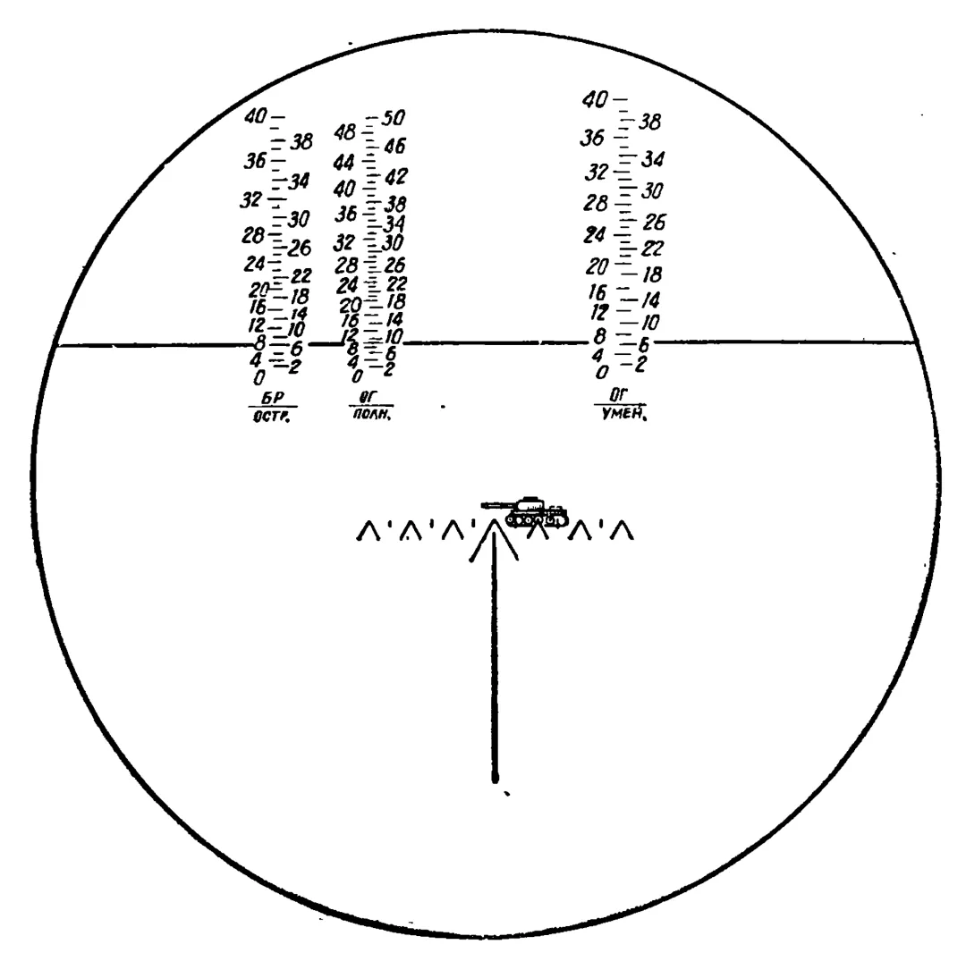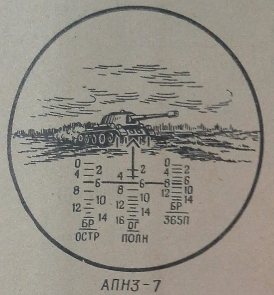 下图展示了 APN-3-7 在使用旧式弹药时的取景器刻划布局。分划板由一个“V”形(Chevron)标记组成,左右各有两个垂直短线用于风偏修正;在“V”形标记下方,是一个呈倒“T”字型的垂直线和水平线。炮手通过转动射程调节旋钮来上下移动分划板,直到水平线对齐所需弹种的对应射程刻度。左侧射程刻度用于尖头穿甲弹(BR-365K),中间刻度用于全装药高爆弹,右侧刻度则用于战争时期的硬芯穿甲弹(APCR)。