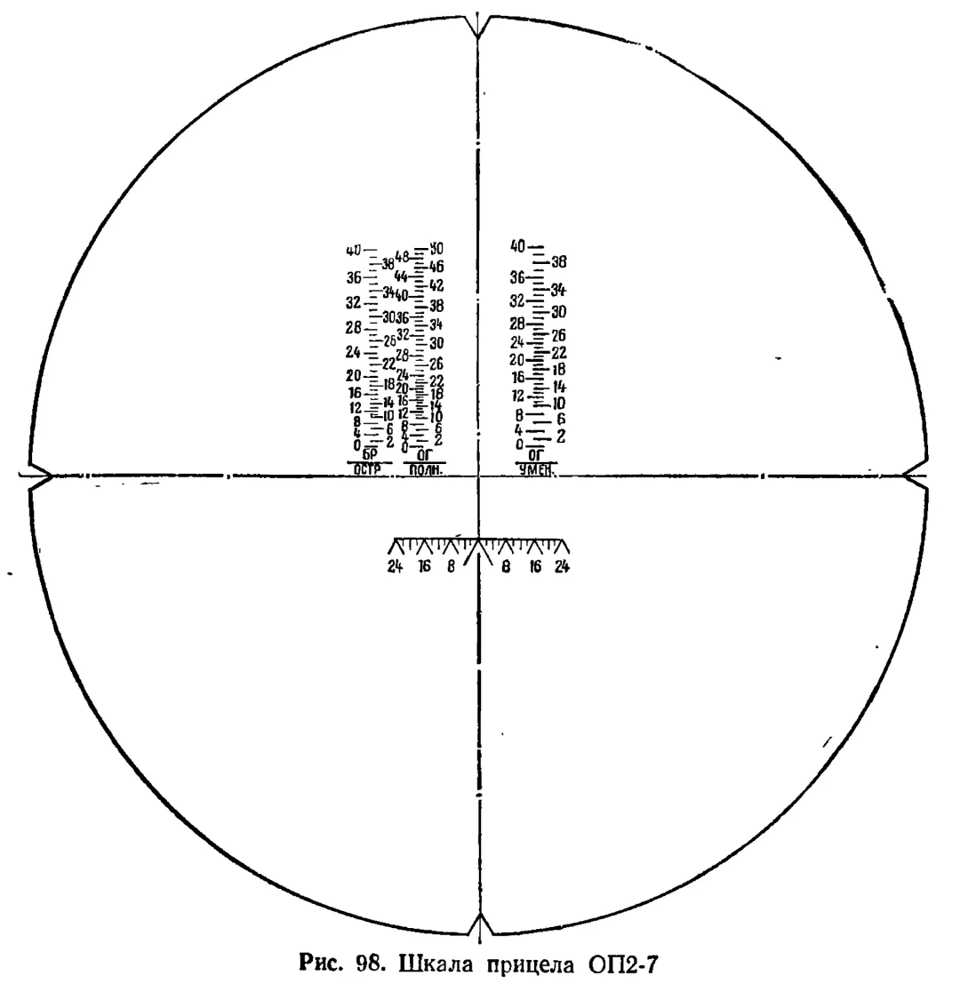 OP1-7 瞄准镜在目镜组透镜前方安装有一根单一的固定水平准线。当调整刻划高度时,炮手通过将射程刻度上的相应刻度与该水平准线对齐,从而选定射程所需的仰角补偿。