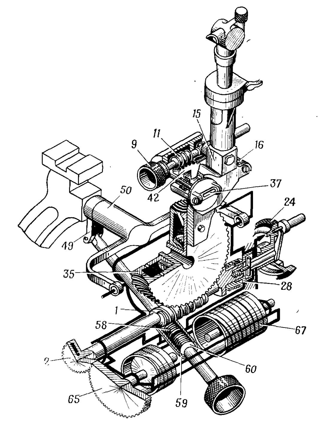 S71 本质上是一个机械装置,旨在将输入角度(以密位为单位)转换为火炮所需的仰角补偿。S71 刚性安装在火炮摇架上,随火炮同步移动。在 S71 上,粗调鼓轮每格代表 100 密位。按苏式定义,一个圆周被分为 6,000 密位,因此鼓轮上刻有 60 个刻度。微调鼓轮每格代表 1 密位,刻有从 0 到 99 共 100 个刻度。当瞄准具的方向角设置为“30-00”时,视线与炮管轴线平行;设置大于 30-00 时,视线向左(逆时针)偏移;设置小于 30-00 时,视线向右(顺时针)偏移。