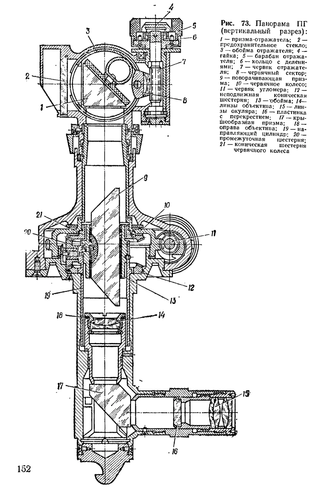 PG-1 是一种赫兹(Hertz)式全景潜望镜,主要用于间瞄射击,也可作为直瞄射击的应急备份。它既是瞄准光学器材,也是测角仪。其旋转全景头上刻有方位刻度,供炮手高精度测量远处两点间的方位角。它安装在 S71 的旋转支架上,因此在 S71 上输入角度设置时,PG-1 的光学系统会向前旋转相应的角度。当火炮进行俯仰调整时,PG-1 能够自动保持水平状态。