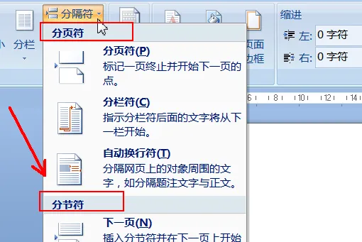 2、在分隔符里面看到有一个分符符,文档添加了分节符之后,需要将分节符删掉,才能将文档里面的页删除。