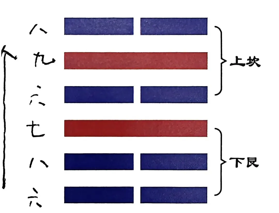 三个铜钱正面全标“三”,背面全标“二”,随机抛出记录每次三个数字的总和。重复六次,将结果从下到上依次记录,单数画阳爻,双数画阴爻,六次之后可得到一个卦象。比如六次依次是“六、八、七、六、九、八”,则得下图所示:
