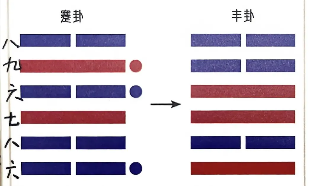 和“六”要变爻,九变阴,六变阳,所以上面卦象又变成了上震下离的“丰卦”,这就是“变卦”。如下图: