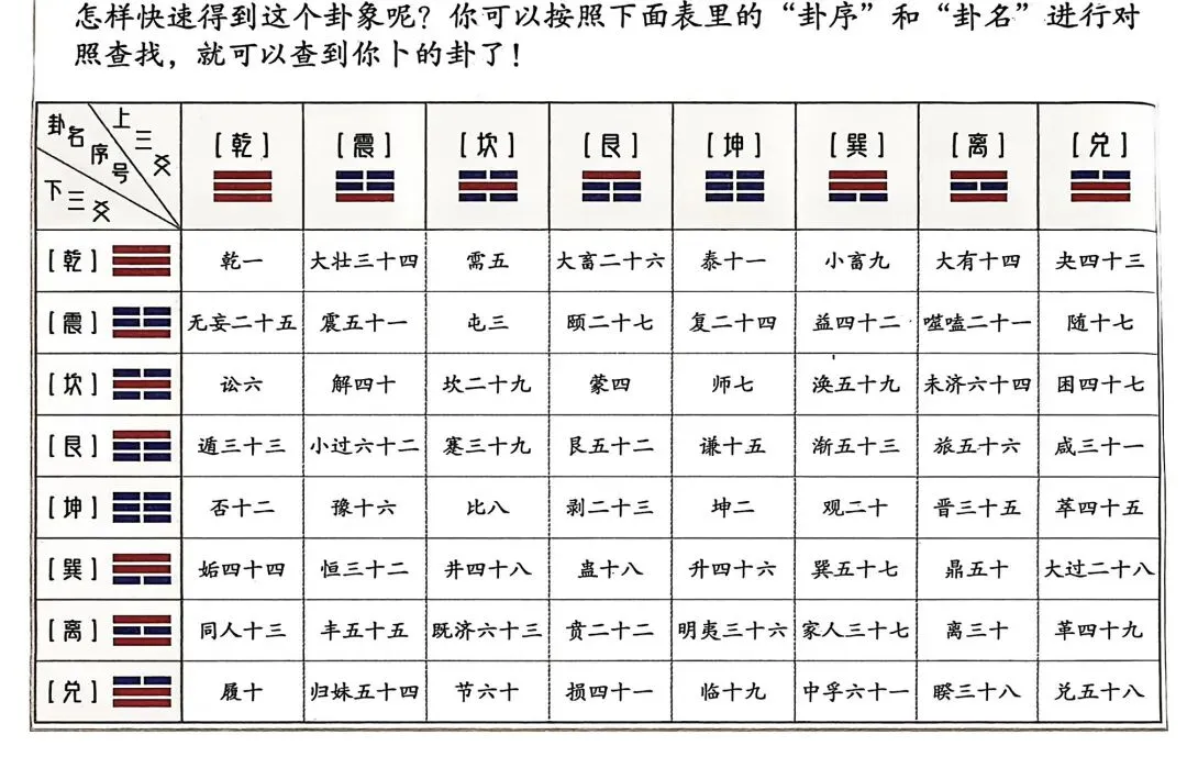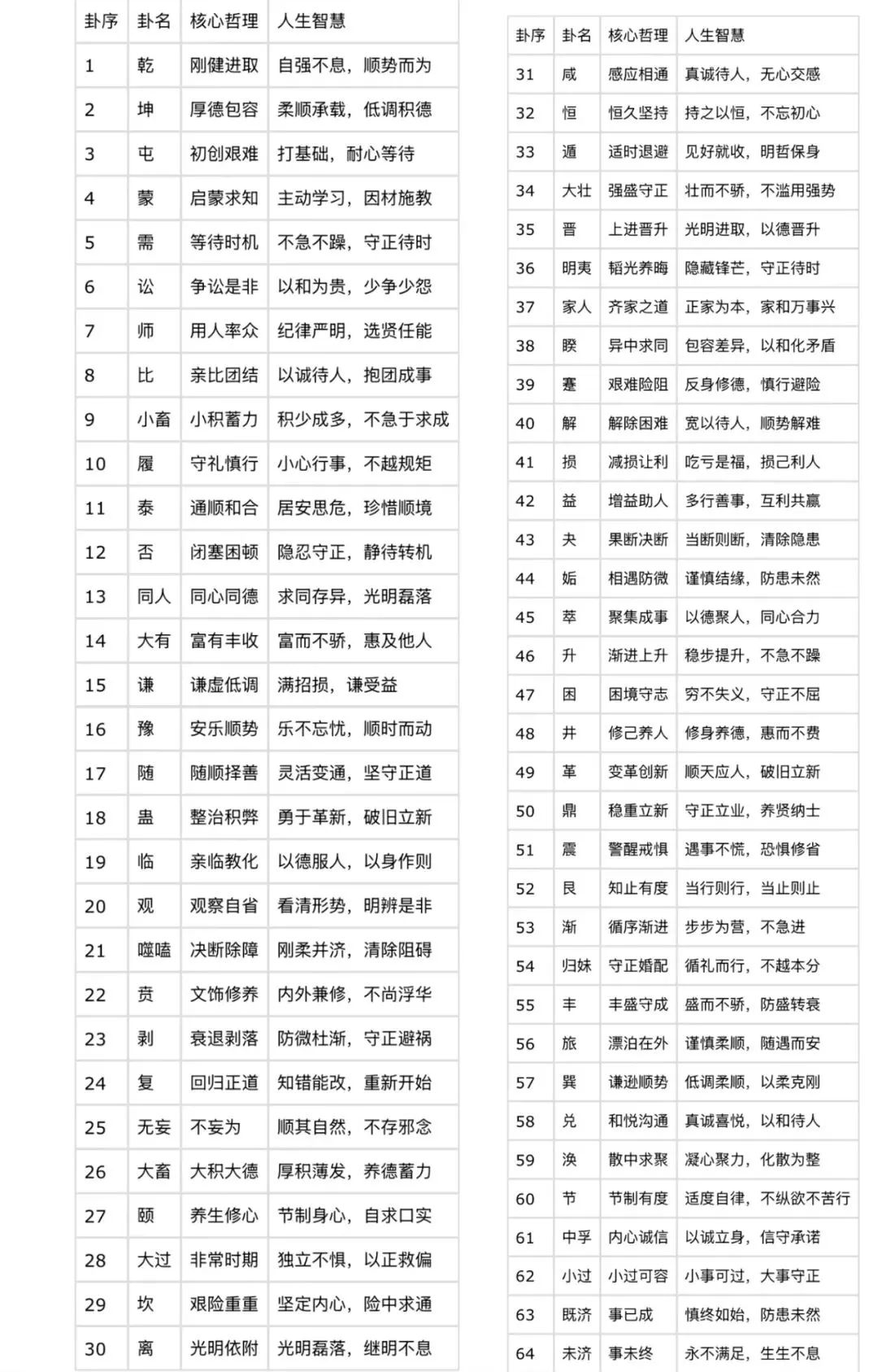 伏羲根据“河图”上观天下观地中观人,将阴阳二爻的三条线八种组合演化成八卦,周文王根据“洛书”演化出升级版六十四卦。《易经》主要介绍六十四卦每种卦象的卦辞,而《易经》中博大精深的哲理和智慧就蕴含在这些卦辞中。