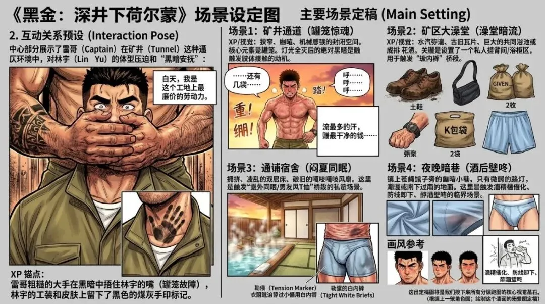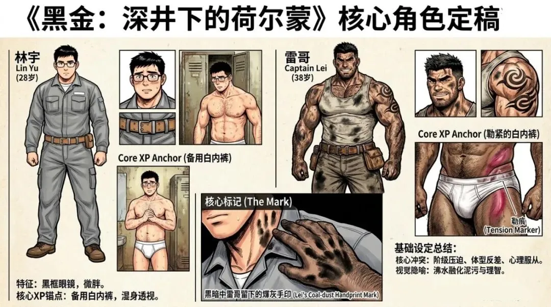 主角:林宇。 28岁,新调来矿区的安全技术员。微胖天菜(U熊),戴着黑框眼镜,穿着相对干净的灰色工装。性格谨慎内敛,但对雄性荷尔蒙有隐秘的渴望。