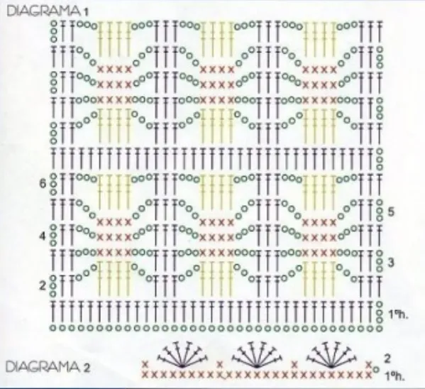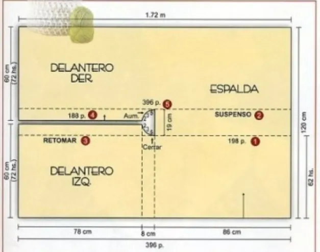 这件披风从左侧开始编织(参照裁剪图)。起396个锁针作为基础链 + 3个起立针,按照图解1编织62行。在198针上编织(这部分对应后片),织到19厘米高,暂停编织,将针目留在一旁备用。接着在前片左侧的针目上继续编织,在领口一侧,于每行开始时进行减针:减5针、3针、2针,从开始算起共织72行,然后剪断线头。对于前片右侧,另起188个锁针作为基础链,平织6行,然后在领口一侧进行加针:加2针、3针、5针。接着在所有针目上继续编织(此时共396针),织到第72行,剪断线头并收针。