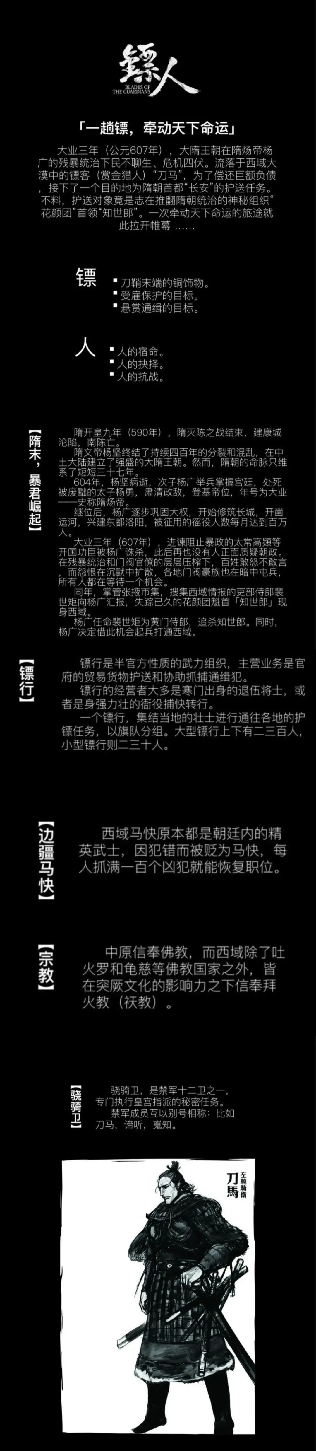 左骁骑卫:融聚胡汉之骁勇精锐,不论出身,不念旧恶,秘密选拔十三死士,以神兽为号,暗杀肃清天子之敌,在黑暗深处捍卫帝王之光荣,谓之左骁骑卫(本作中,唯有宇文化及与男主角刀马未使用神兽之名作为代号)。