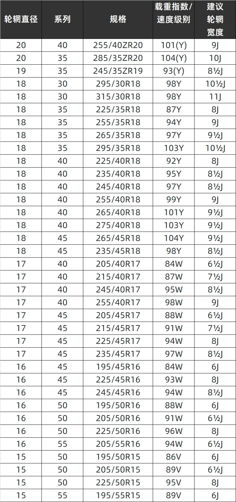 A052 的尺寸覆盖广泛,从 15寸到20寸,适合多种车型:
