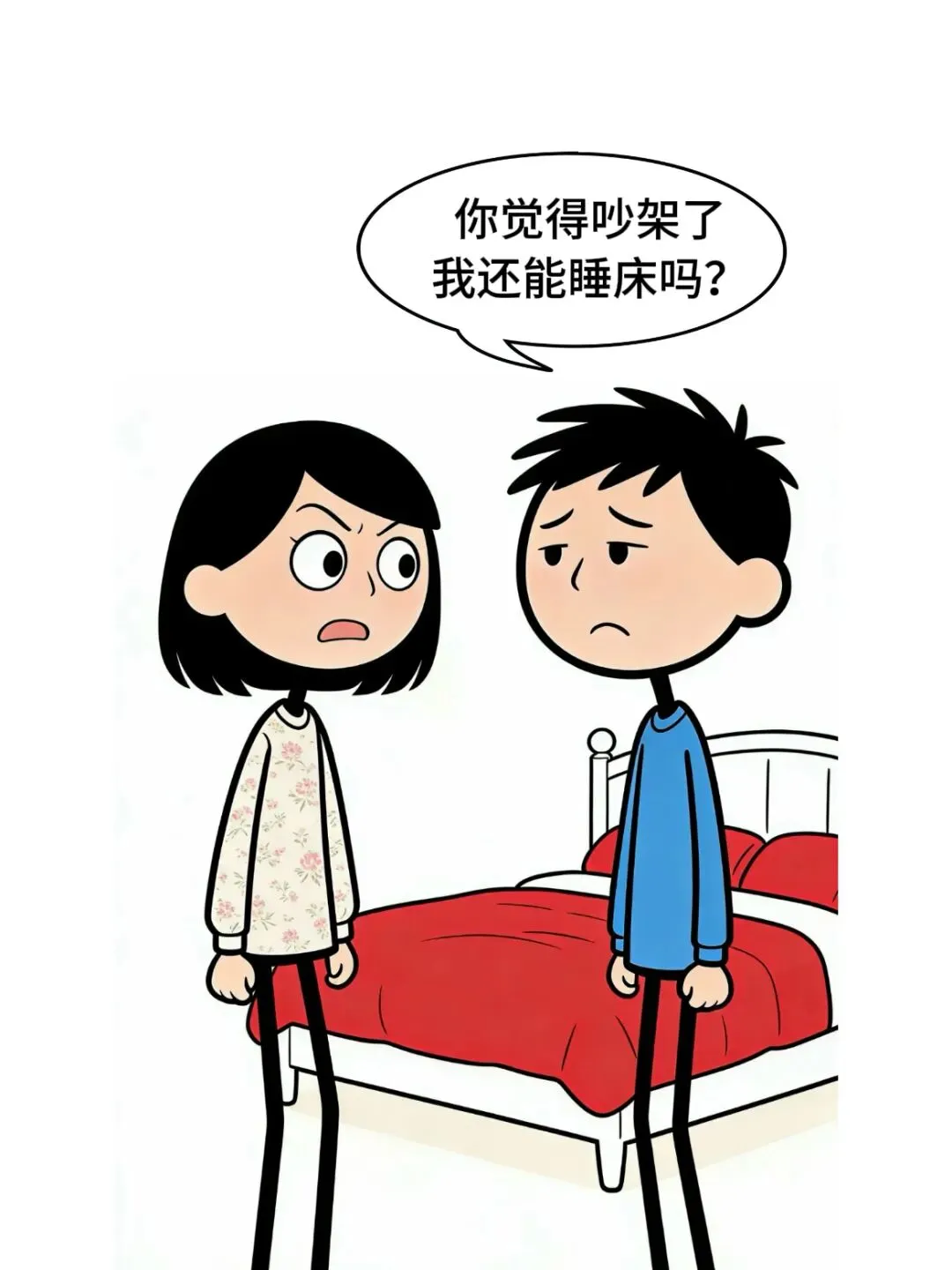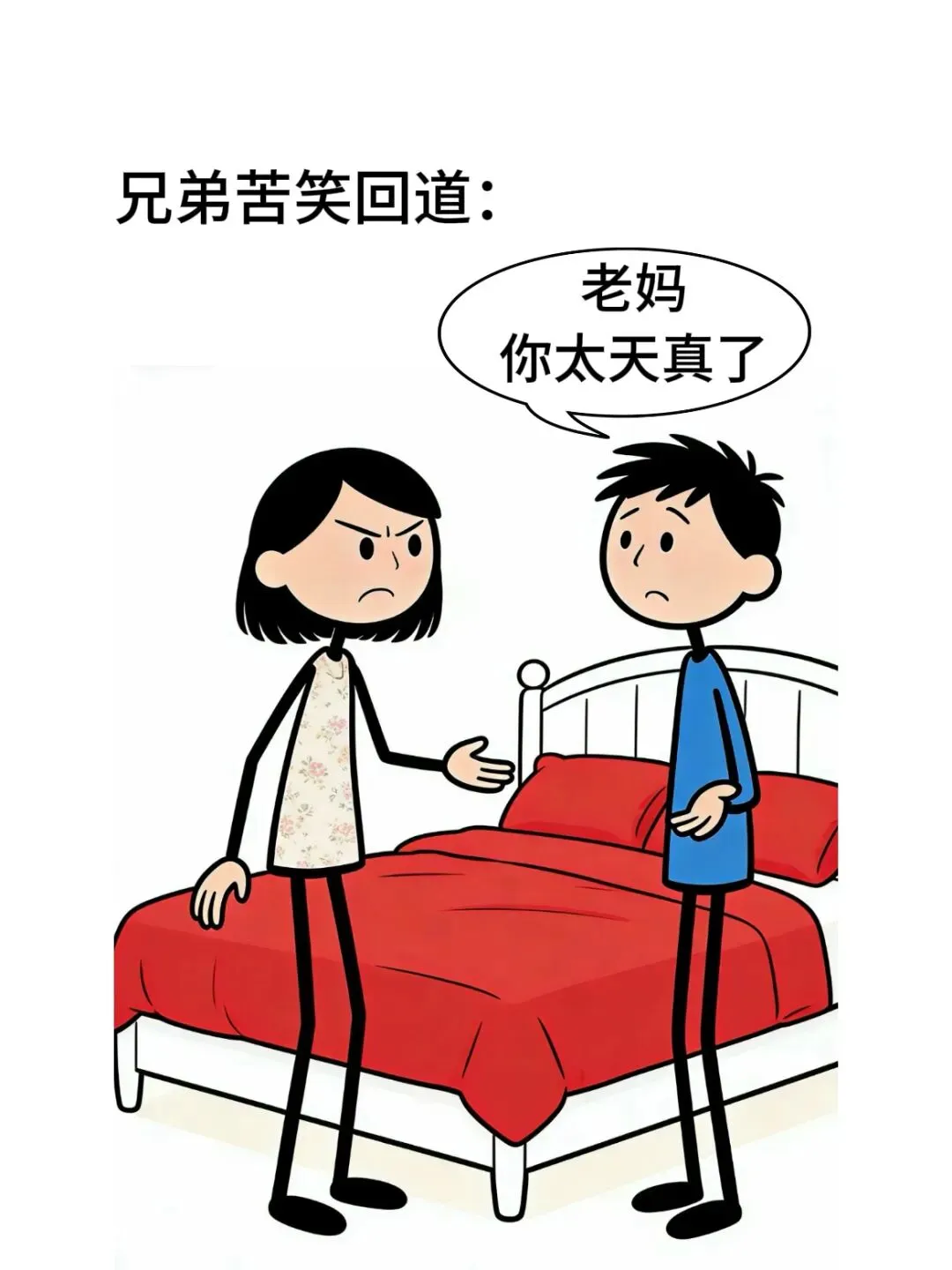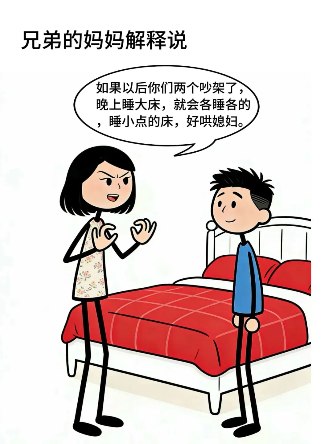 开心漫画:妈妈:不能买一米八的大床,要买一米五的.儿子:为什么?妈妈:如果以后你们两个吵架了,晚上睡大床,就会各睡各的…