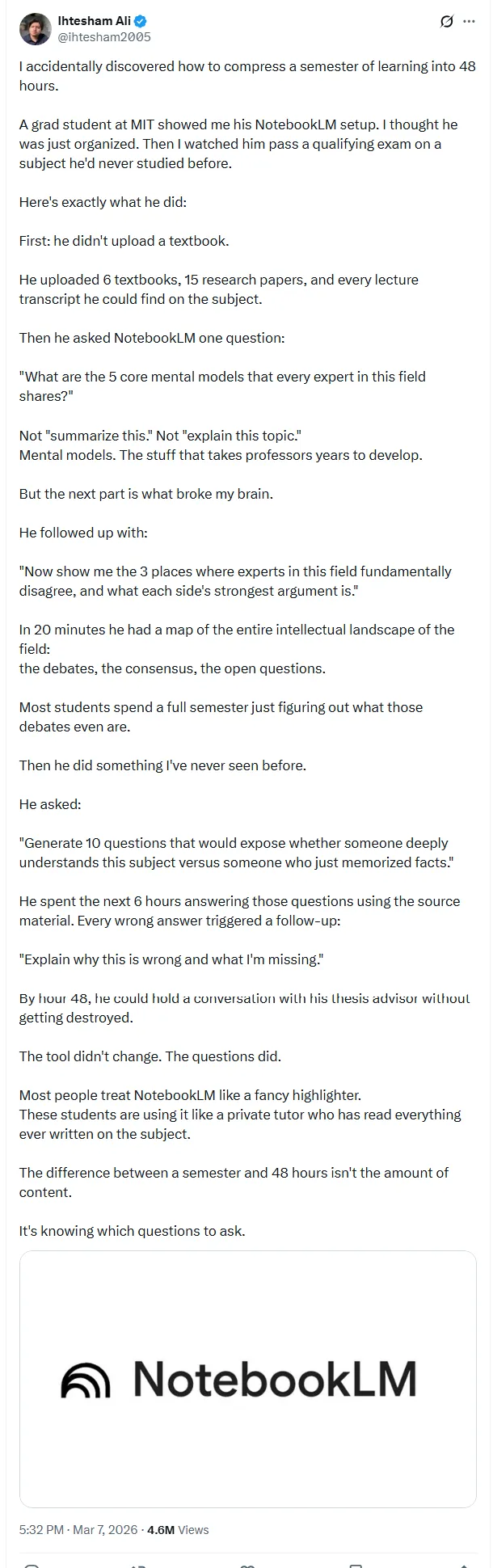 工具没变,问题变了。大多数人把NotebookLM当作一个高级荧光笔。但这些学生把它当作一个私人导师,一个读完了这个主题所有资料的导师。一学期和48小时的区别不在于内容的数量,而在于知道要问什么问题。