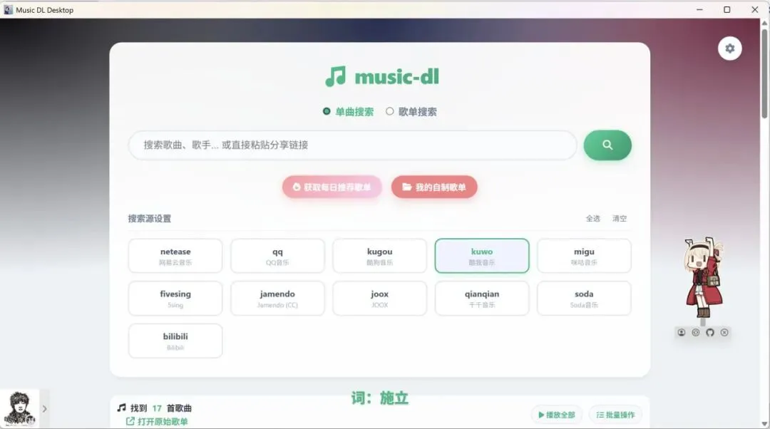 Go Music DL 是一个音乐搜索与下载工具,支持 Web 界面、TUI 终端 和 桌面应用 三种使用模式。你可以在浏览器试听,也可以在终端里批量下载,或使用原生桌面应用享受最佳体验。内置网易云、QQ、酷狗、Bilibili、汽水音乐等 10+ 个主流平台,支持多源并发搜索与无损音质解析