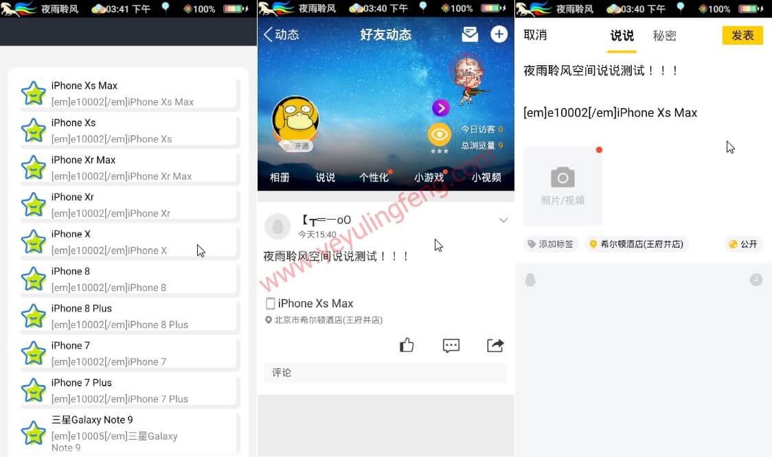 代码看的脑瓜子嗡嗡的,以上代码是将所有装13功能都整理上了,大家需要那些直接复制使用即可,代码之间可以随意组合拼接,如果要在发表说说时显示机型,参照上面的代码修改即可,实例如下:
