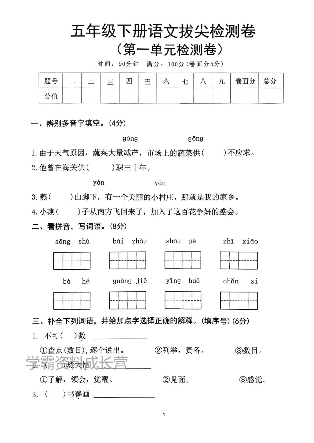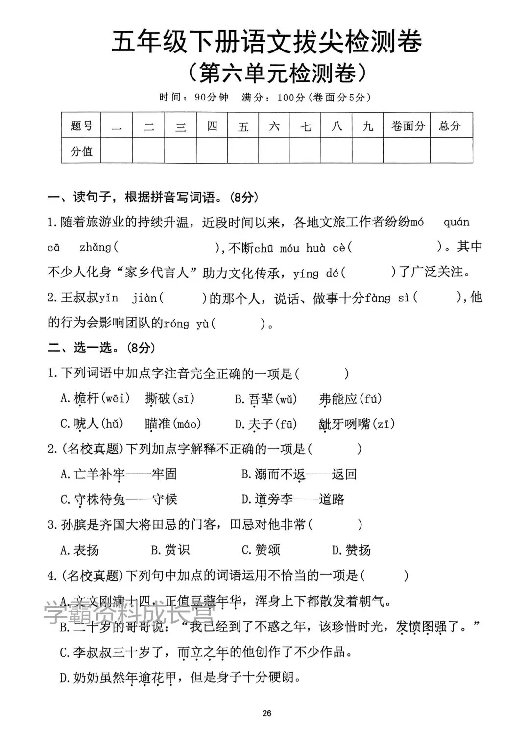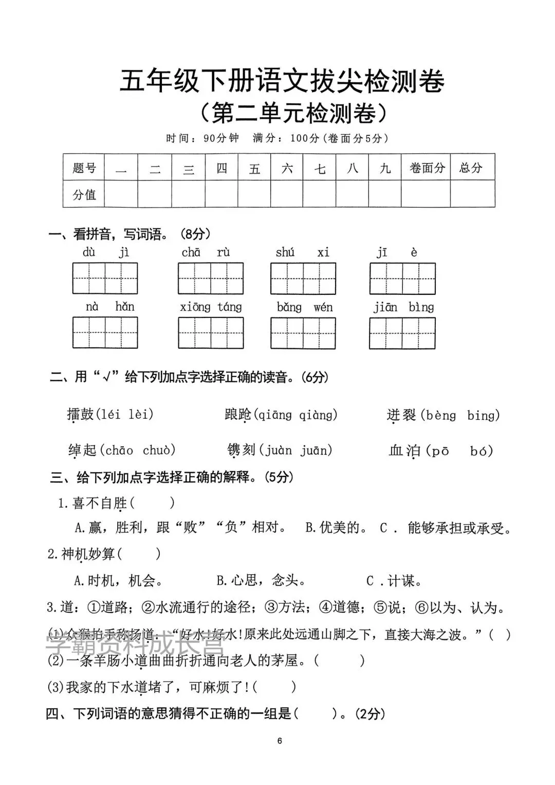 26年春五年级下册人教部编版语文 《1-8单元拔尖测试卷》8套附答案,电子版可打印,这套资料涵盖1~8单元基础拔尖培优测试,有期中、期末真题、专项突破、高频考点、易错题、常考易错点,帮助孩子夯实基础,及时查漏补缺,掌握解题思路,提高孩子应试能力,提升学习成绩需要的家长抓紧打印出来,让孩子在练一练吧
