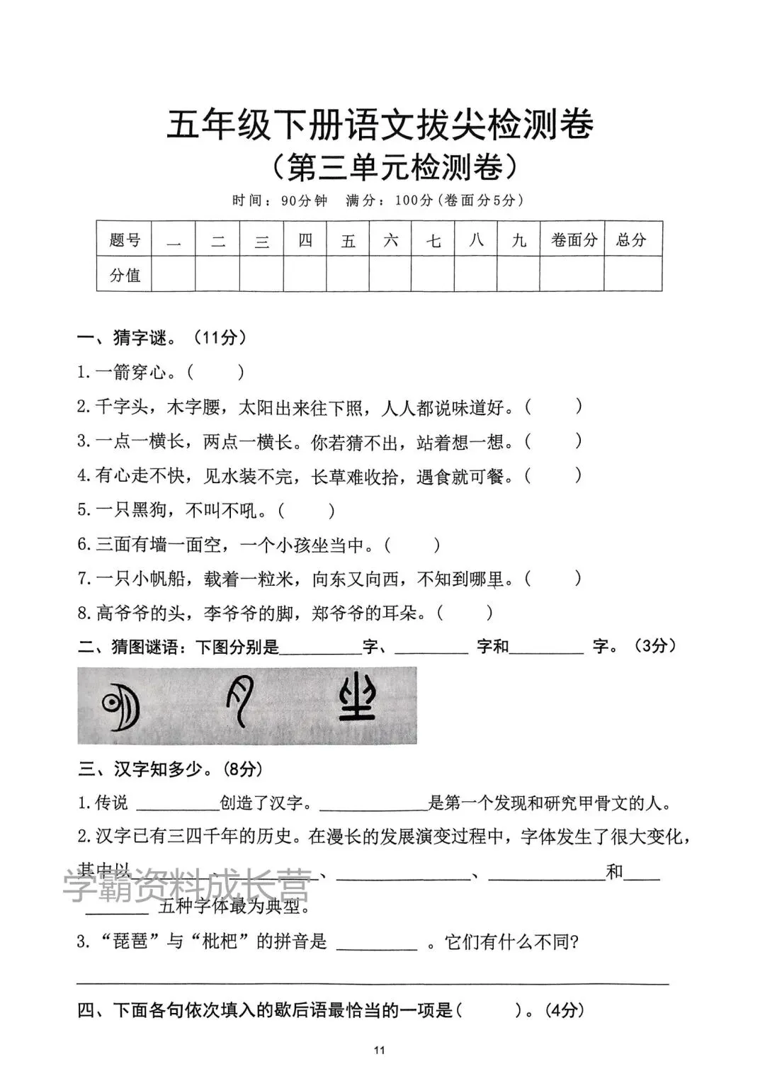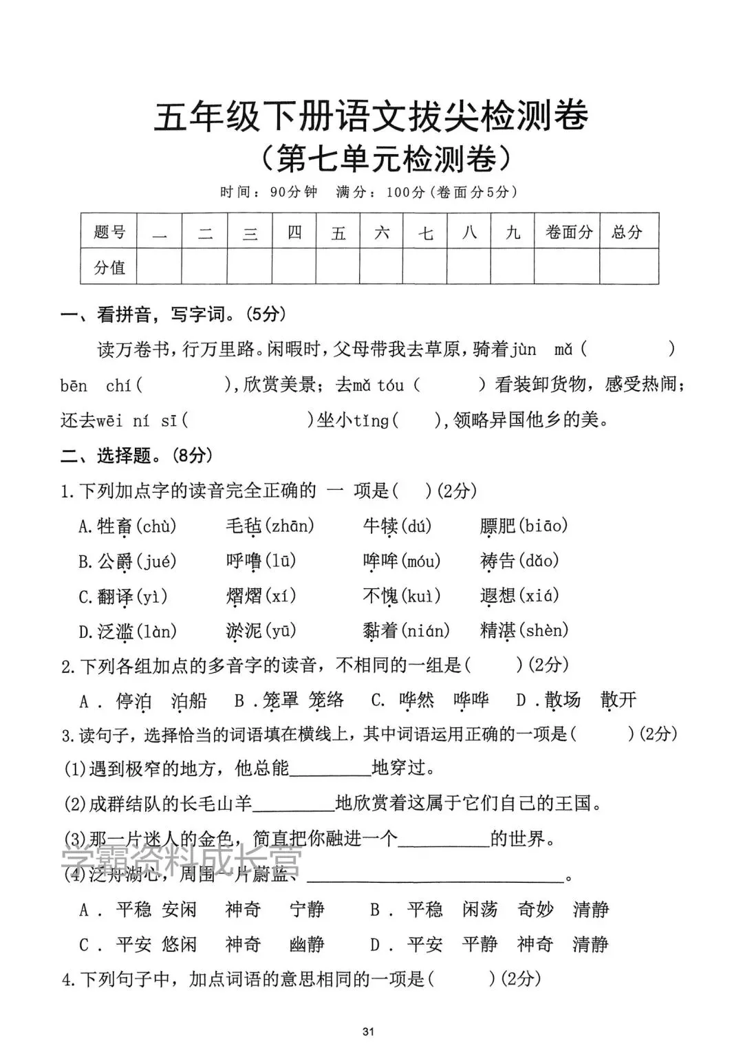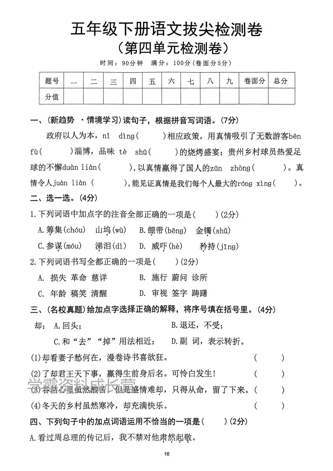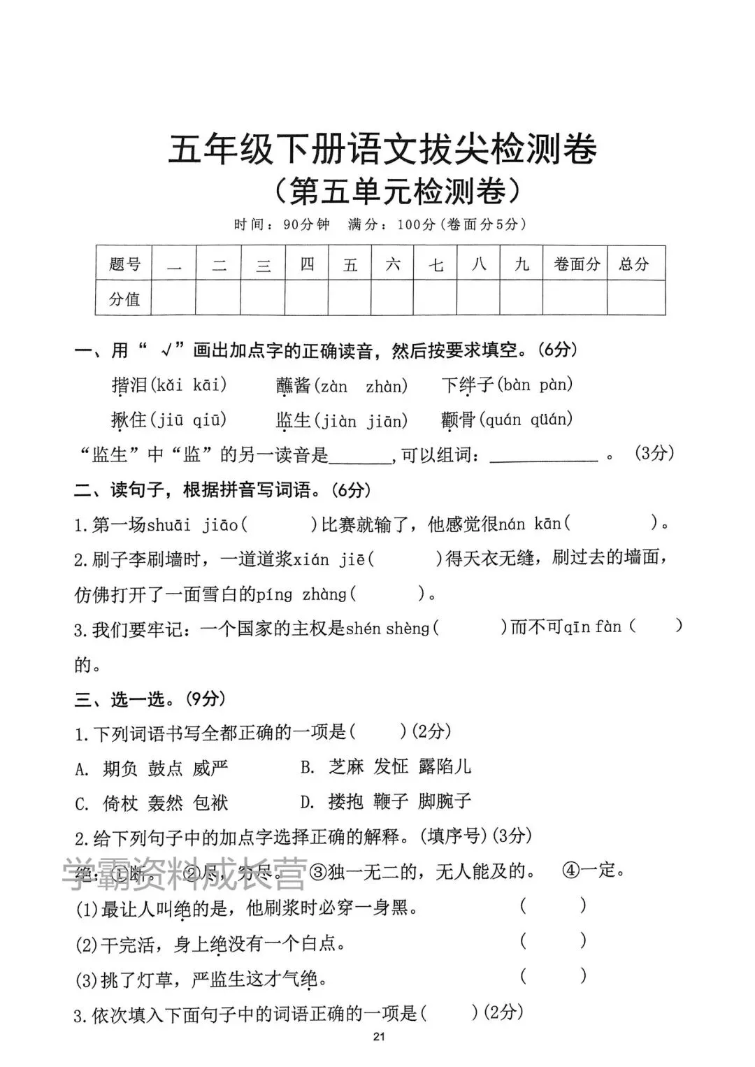 26年春五年级下册人教部编版语文 《1-8单元拔尖测试卷》8套附答案,电子版可打印,这套资料涵盖1~8单元基础拔尖培优测试,有期中、期末真题、专项突破、高频考点、易错题、常考易错点,帮助孩子夯实基础,及时查漏补缺,掌握解题思路,提高孩子应试能力,提升学习成绩需要的家长抓紧打印出来,让孩子在练一练吧