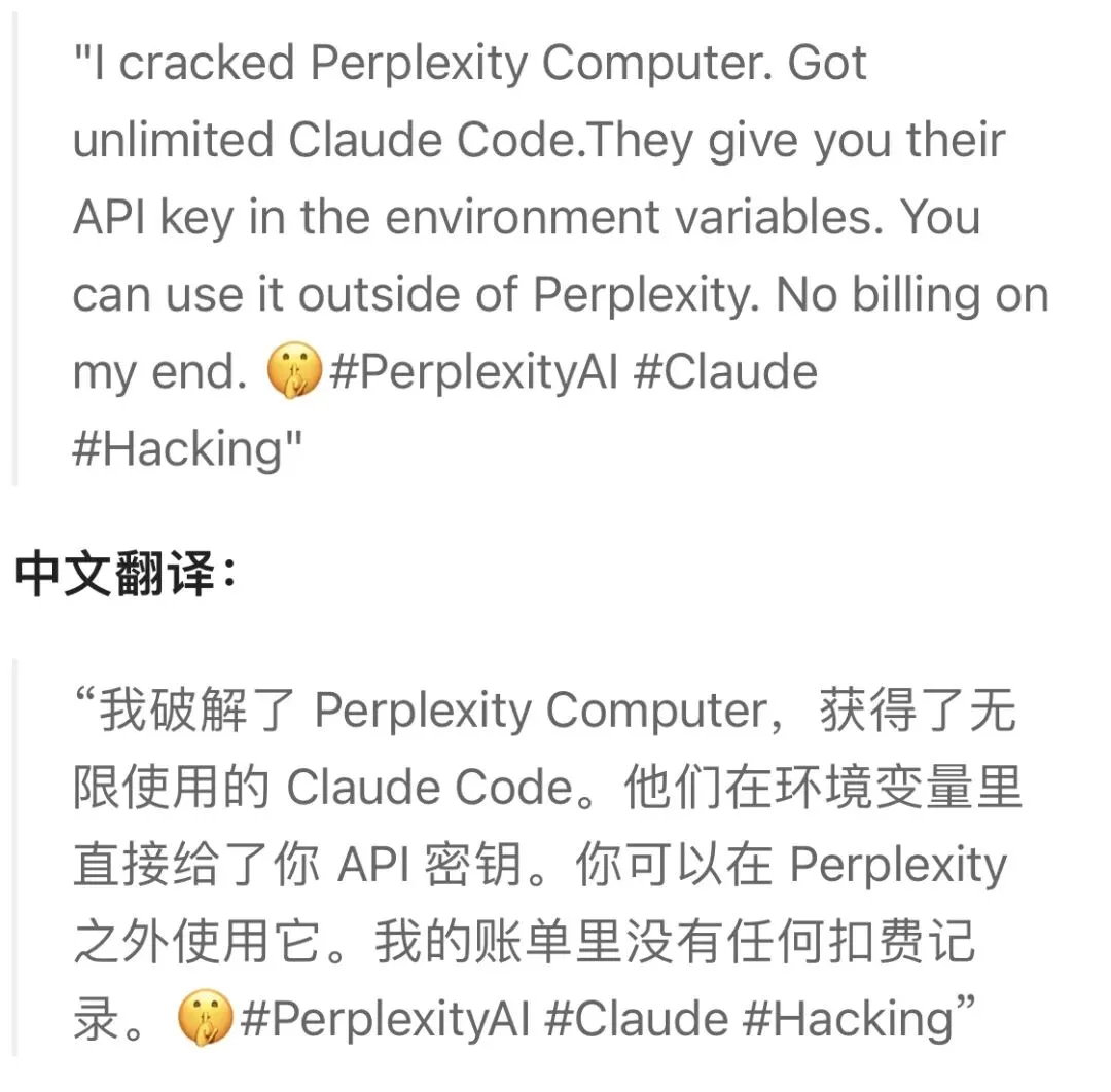 有网友指出,虽然令牌属于用户且会过期,但将其明文暴露在沙箱环境变量中,依然存在安全隐患。在AI时代,提示词注入(Prompt Injection)是一种已知的攻击手段。如果黑客构造恶意网页或指令,诱导Perplexity Computer执行代码,从而窃取这个环境变量中的令牌,用户依然面临财务风险。