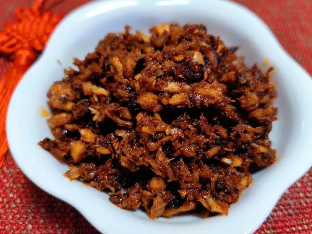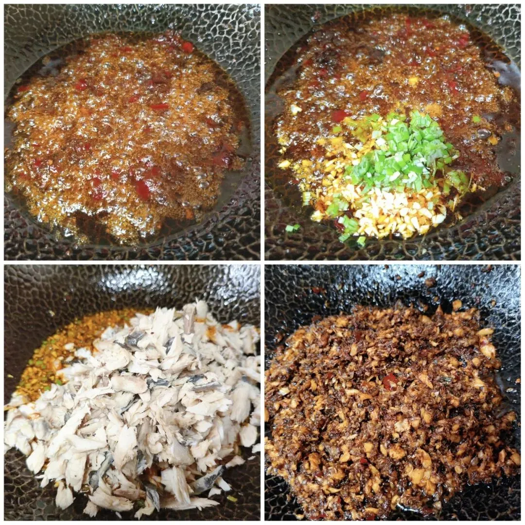 全程不加水,慢慢炒干鱼肉的水分,更利于保存,吃起来也更香。