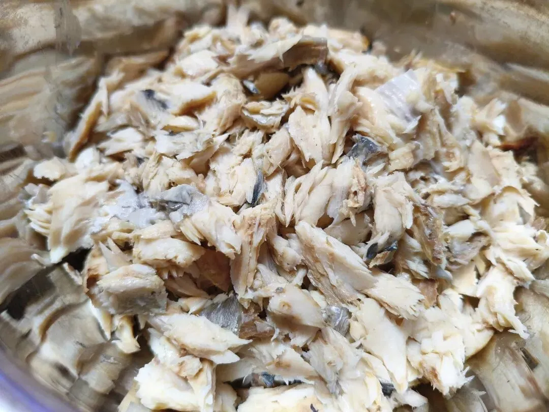 把蒸好的鲅鱼去刺,鱼肉直接掰成小块,如果喜欢吃更加细腻的类似于鱼绒那样的,可以用刀背剁一下。