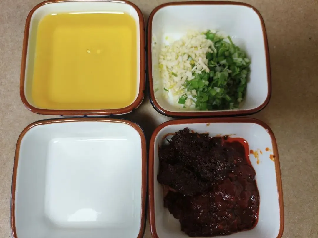热锅凉油,油热后先加入郫县豆瓣酱和干锅酱,小火慢炒,炒出香味和红油,加葱花和蒜末煸炒。