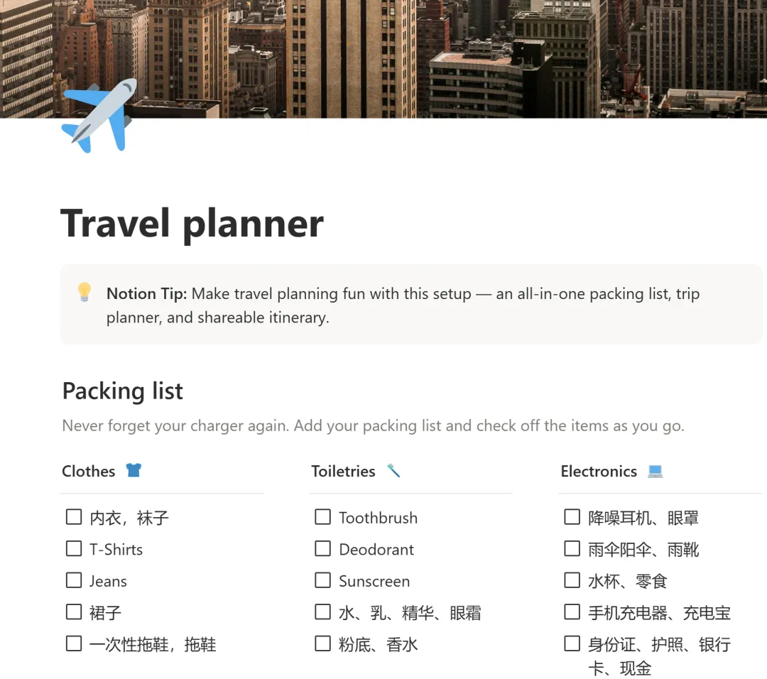 我用 Notion 搭了一个旅行规划神器:打包清单 + 行程表 + 可复用模板