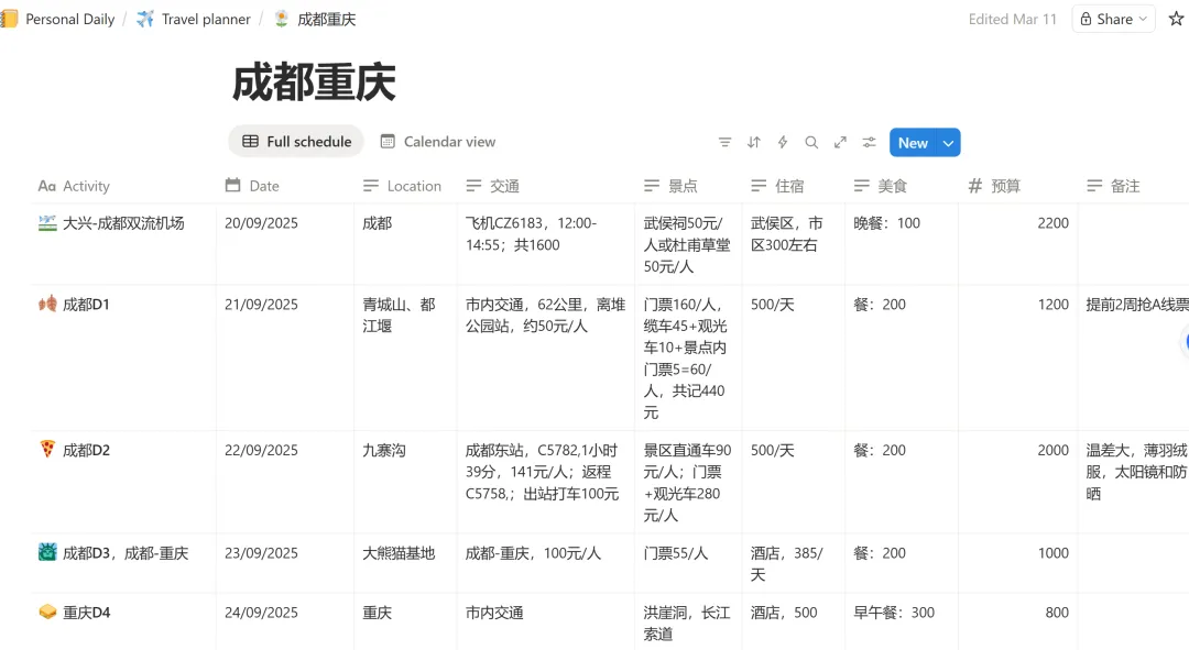 你现在的做法是:在 Schedule 下创建不同旅行的子页面(例如:广州潮汕、成都重庆、日本、北京等),每个旅行一页,清晰又不打架。