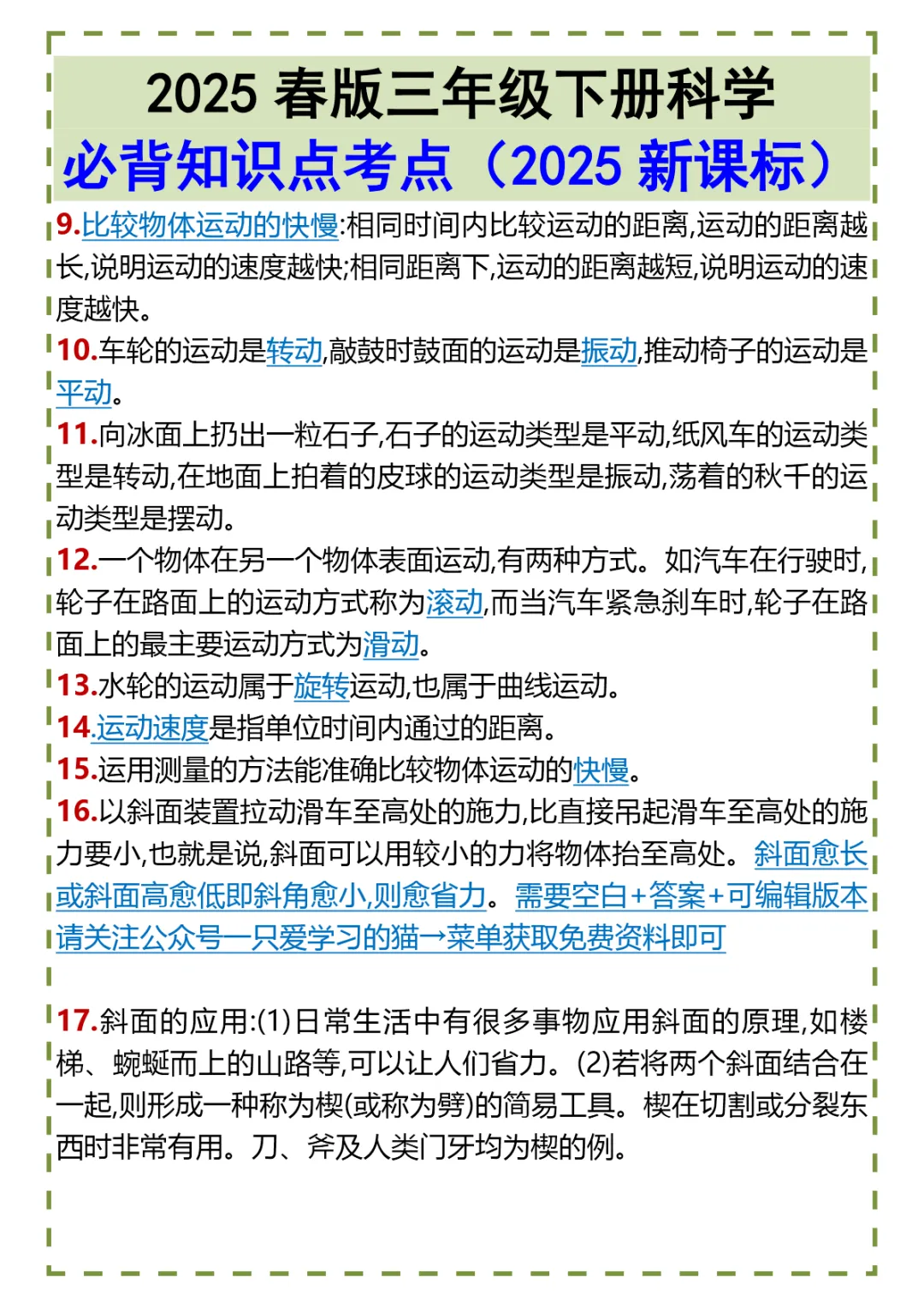 【免费资源】,三年级(下)科学 必考知识点考点,可打印,PDF电子版,保存后下载