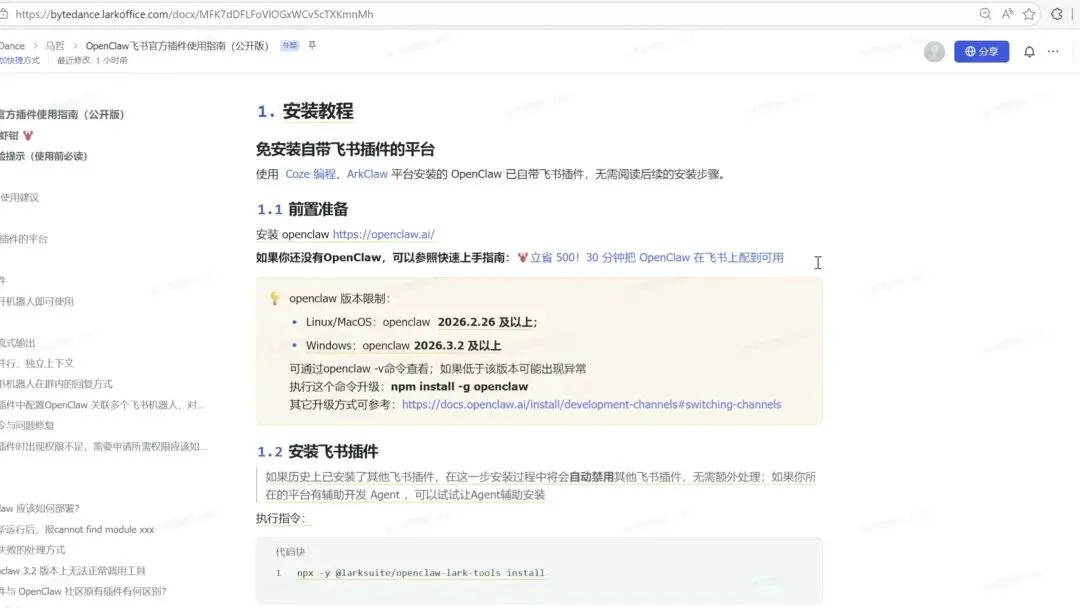 接下来可以安装飞书官方插件,我们复制文档里这一段命令,粘贴到命令行执行。