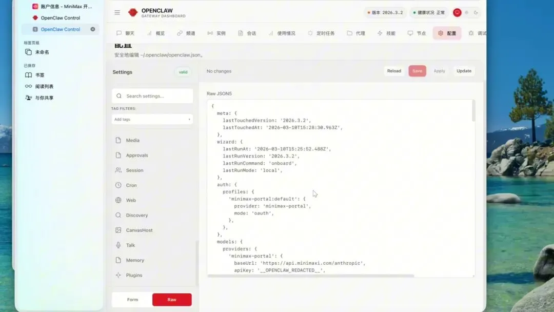 安装完 OpenClaw 以后,要做的第一件事就是来修改一个配置。我们来到 OpenClaw 的控制台,找到设置,开启 Raw 也就是源文件模式。