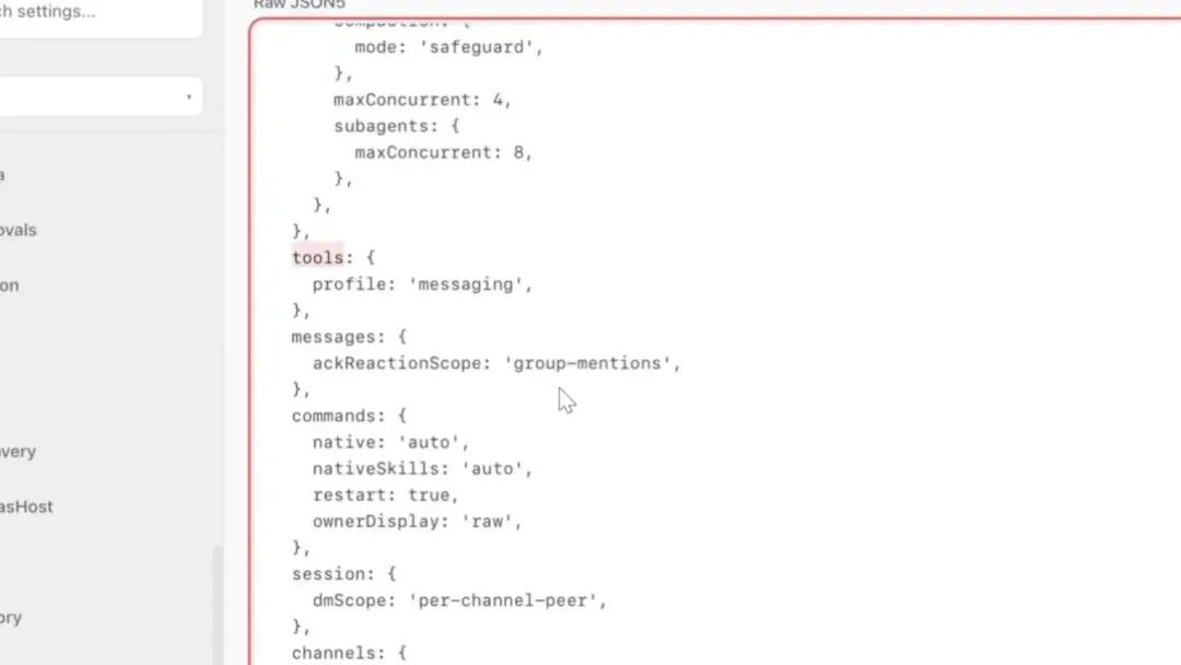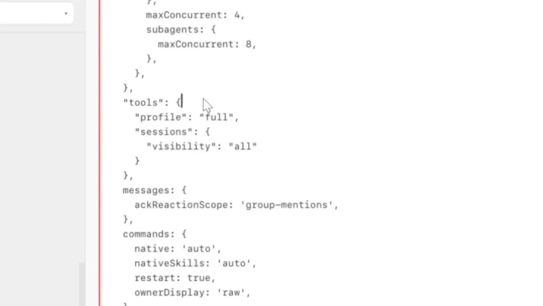 我们要修改的是tools 这一段。在默认配置,也就是 messaging模式下面,OpenClaw 只能进行聊天,做不了任何其他的事情。