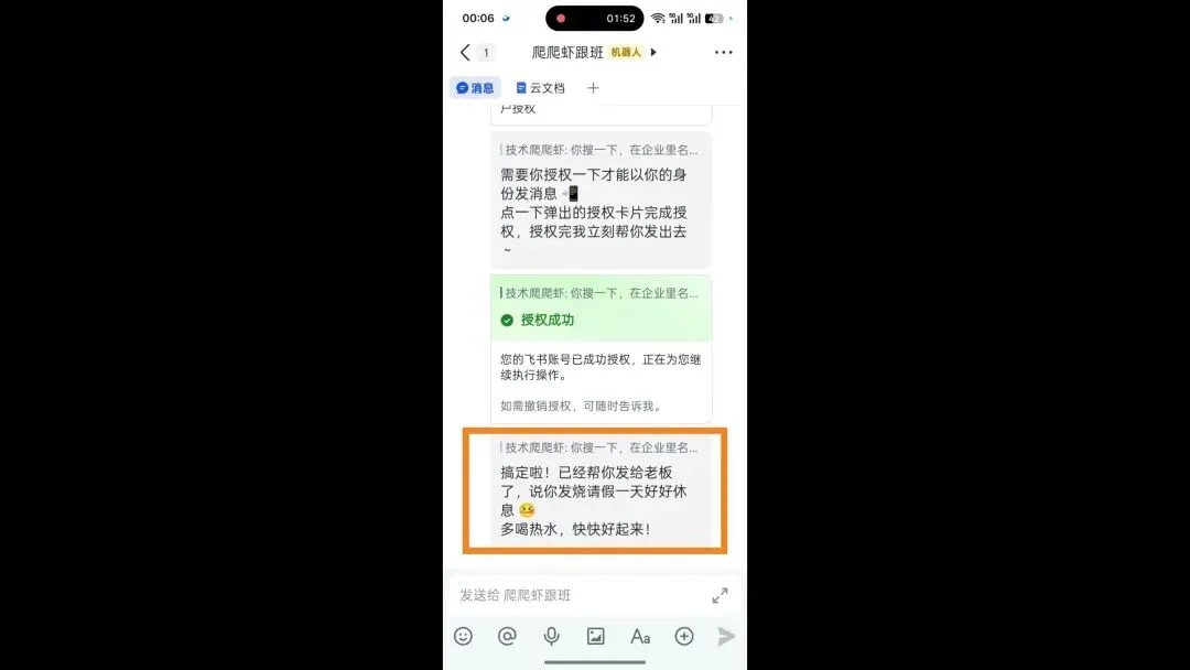 接下来它真的成功完成了操作,直接用我的账号发出了请假消息,这可太好玩了!