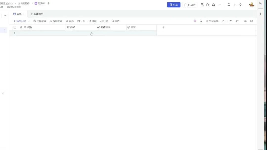 多维表格,我认为这就是飞书里面最强大实用的功能。多维表格迭代至今,远远超出了传统数据表格的功能,而是进化成了普通人也可以轻松上手的全能数据库。现在有了飞书官方插件,我们直接可以使用自然语言,零门槛创建一个私人数据管理系统。我们来看一个简单的例子,我可以直接跟 AI 说:“创建一个飞书多维表格,用来记账,需要包含金额、商品名称、消费地点,还有类型这些字段。” 很快 OpenClaw 完成了表格的创建,交付了一个链接,点进去就可以看到我们的表格。