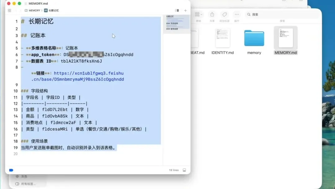 然后我告诉 AI:“你把这个表格写入你的长期记忆,如果我发你的截图是个账单,你就把这个信息存入多维表格。” 在它的 MEMORY.md