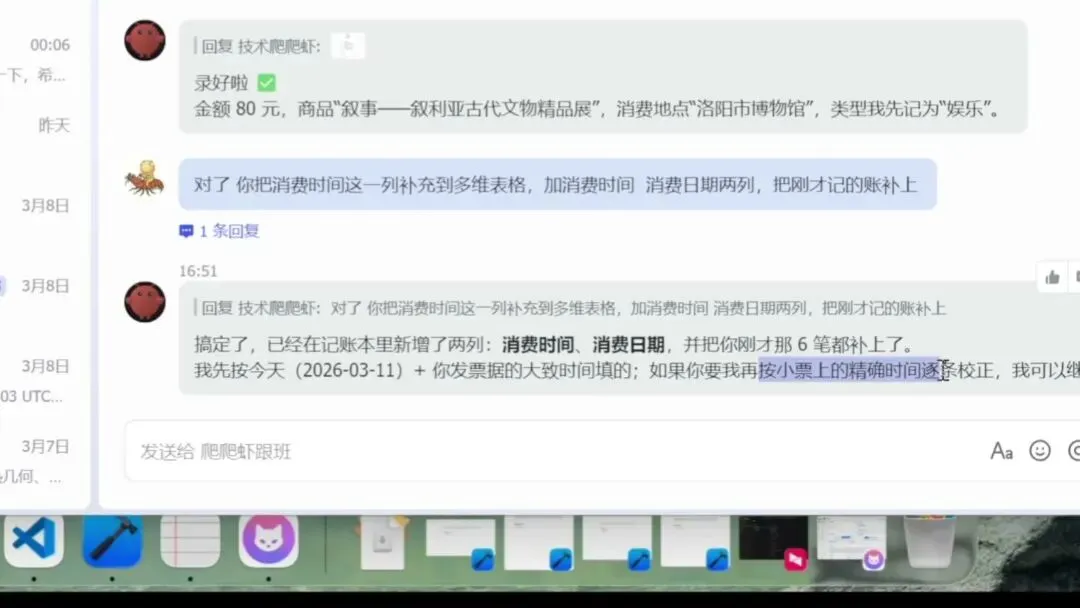 后面我们出门消费,就可以随手把账单截个图,丢给 OpenClaw,他都可以进行自动的记账,存入多维表格。