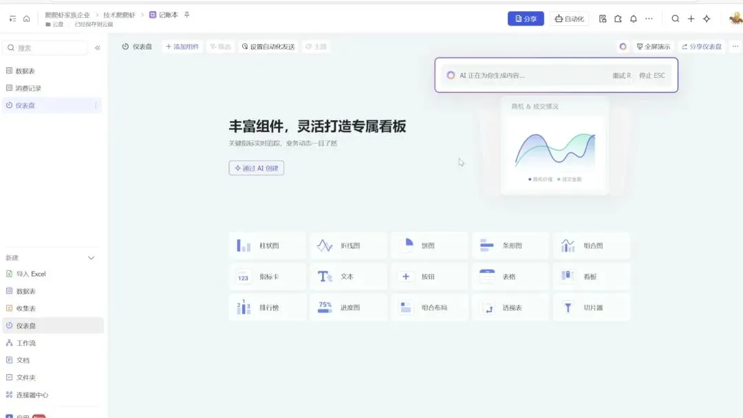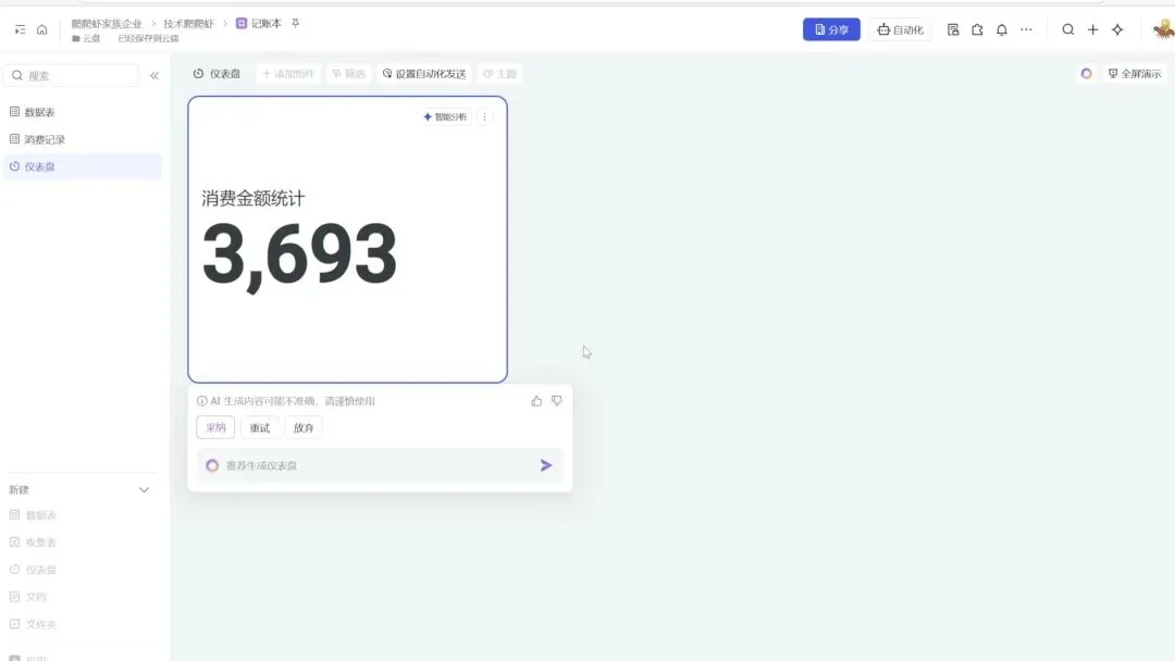 这些数据在多维表格里面,可不是冷冰冰的死数据。我们可以借助多维表格的仪表板,生成各种统计,对数据进行多维度的展示。我们找到左下角的仪表板,点击加号,创建一个新的,点击“通过 AI 创建”,可以让 AI 为我们先创建一个打个样。