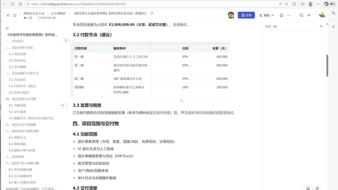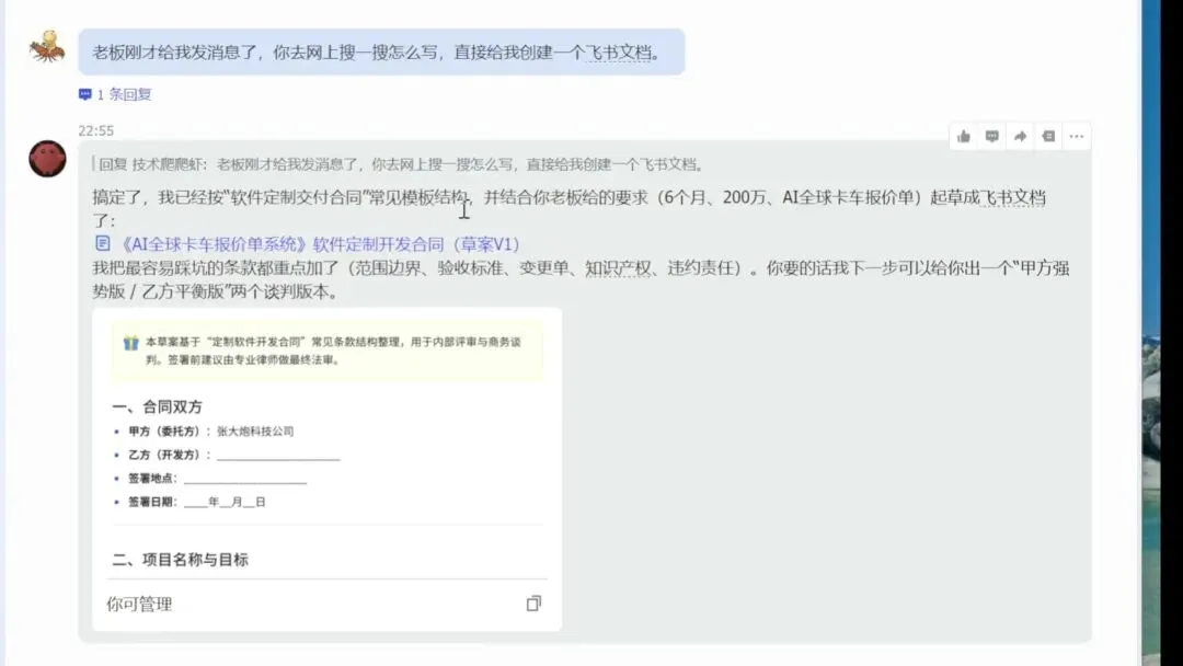 除了多维表格,飞书官方插件也可以帮助我们来操作文档。比如老板突然丢过来这么一个需求,让我拟一个软件交付类的合同,我们公司作为乙方。如果人工先去搜索合同模板,然后再来一步步的写,估计半天时间就没有了。我们完全可以把这个需求交给 OpenClaw。这里我跟我的小跟班说:“刚才老板给我发消息了,你去网上搜一搜怎么写,直接给我创建一个飞书文档。” 我们看到 OpenClaw 在后台调用各种搜索功能,来查找这类合同的标准写法,最后为我们交付了一个飞书文档。
