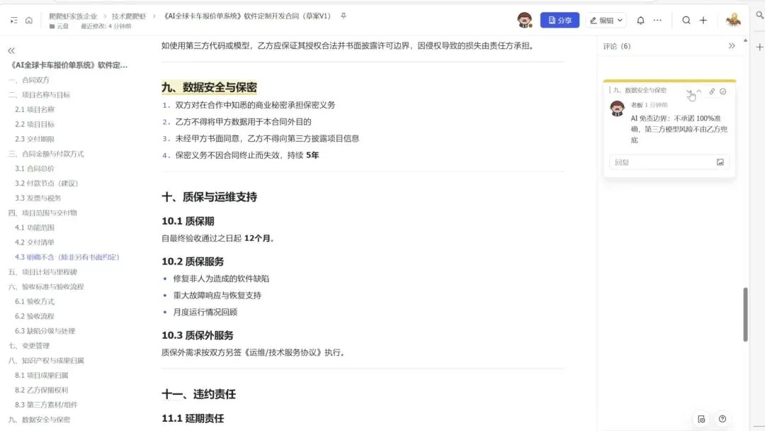 这些批注当然也不用我自己手改,我跟 OpenClaw 说:“合同上老板留了很多的批注,你改一改。改了什么,做个摘要发给我,然后给老板发个消息说已经改好了。” 很快 OpenClaw 根据老板的批注点,逐一进行了修改,而且修改人就是我自己,天衣无缝。