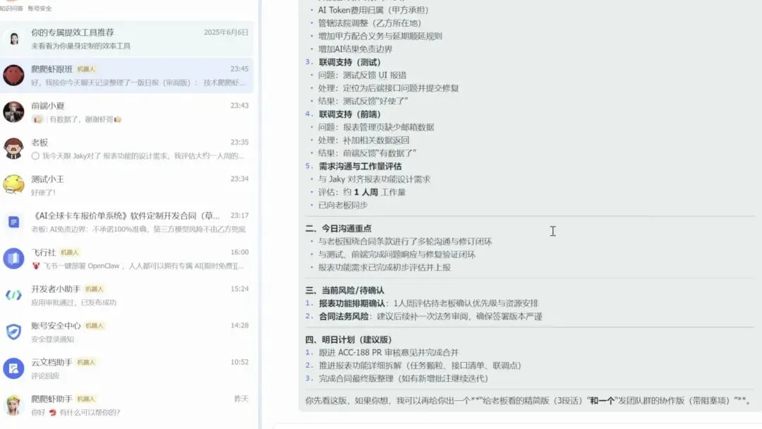 如果你们公司的办公软件恰好是飞书,那你有福了。在飞书官方插件的加持下,AI 可以调用飞书里面几乎一切可用资源,来为你的办公场景服务。比如“爬爬虾”是一个程序员,一天里忙于应付各种琐事,到了临下班晕头转向的,甚至都不记得今天干了些啥。这时候如果要我写日报,那就得去翻各种聊天记录,才能勉强捋清楚。这种工作就完全可以交给 OpenClaw 来代劳。“你搜一下我今天所有的聊天记录,整理一个我今天的日报,然后发给我审阅。” OpenClaw 真的能搜索到我所有的聊天记录,比如找到了我今天完成的工单、起草的合同、支持的测试、解决了前端问题,还跟产品经理对需求等等。最后输出了一个日报,发送给我审阅。