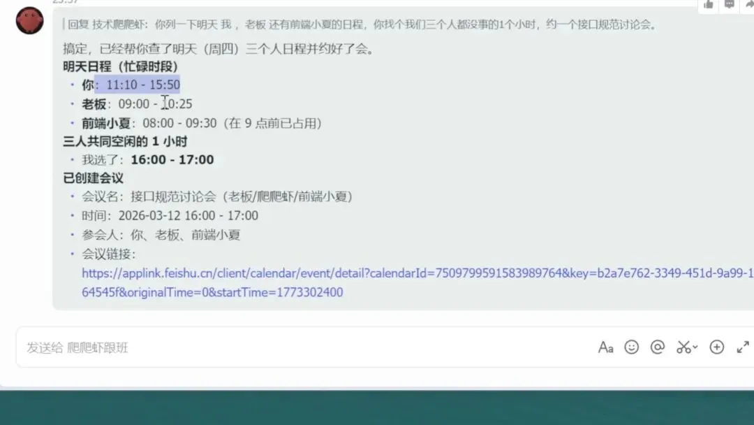我们再来看一个例子:“查一下老板、前端小夏,还有我明天的日程,找个我们三个都空闲的时间,约个一小时的会。” OpenClaw 查阅了我们三个人的日程安排,找到了一个我们三个人都空闲的时间,直接创建出了会议日程。
