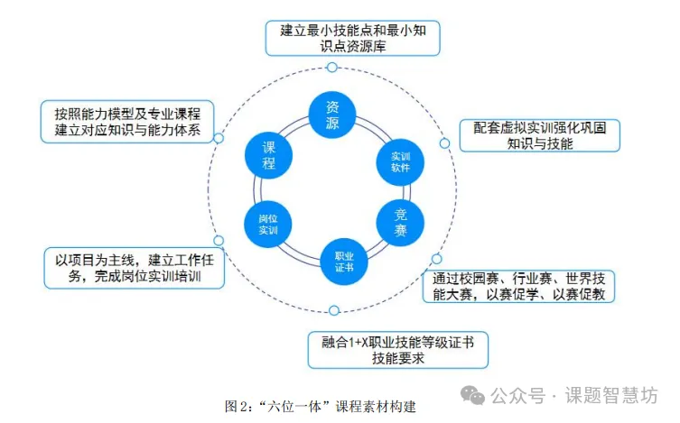 以在线资源、专业课程、岗位实训、职业证书、技能竞赛、虚拟实训构建“六位一体”课程素材,解决课程教学资源、实训资源、实训场所等不足问题。