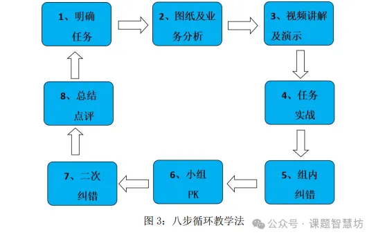 以完成民居设计“柱梁墙板”建模的“八步教学法”。教学前的准备包括:1)项目化教学资源准备:一个项目整体图纸;2)项目拆分(拆分成阶段任务书):绘制标高和轴网、绘制墙体、绘制门窗、绘制楼梯、绘制楼板、二层至屋顶绘制、屋顶绘制、零散构件绘制。任务驱动为导向八步循环教学法的具体教学活动过程为:明确任务、图纸及业务分析、视频讲解及演示、任务实战、组内纠错、小组PK、二次纠错、总结点评。