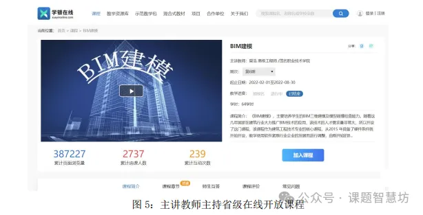 《BIM建模》课程是2021年省继续教育质量提升工程优质继续教育网络课程,在超星学银在线平台进行全国推广宣传,面向其他院校学生和社会学者公开共享,目前有多所学校、2372名学生选课在线学习。