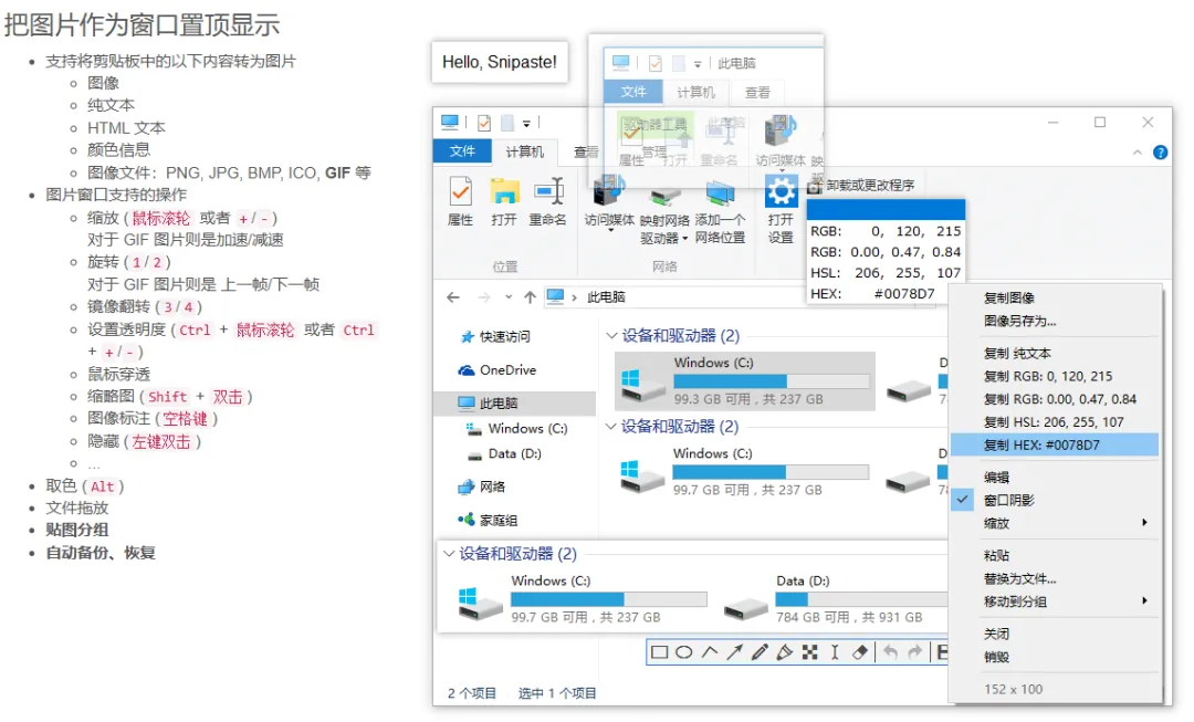 这是Snipaste的王牌特色功能,截图后按下快捷键F3,即可将图片置顶贴在桌面,支持任意缩放、旋转、调节透明度,还能同时粘贴多张截图。写文案、做表格、查资料时,不用来回切换窗口,对照截图直接操作,彻底告别反复切屏的麻烦。