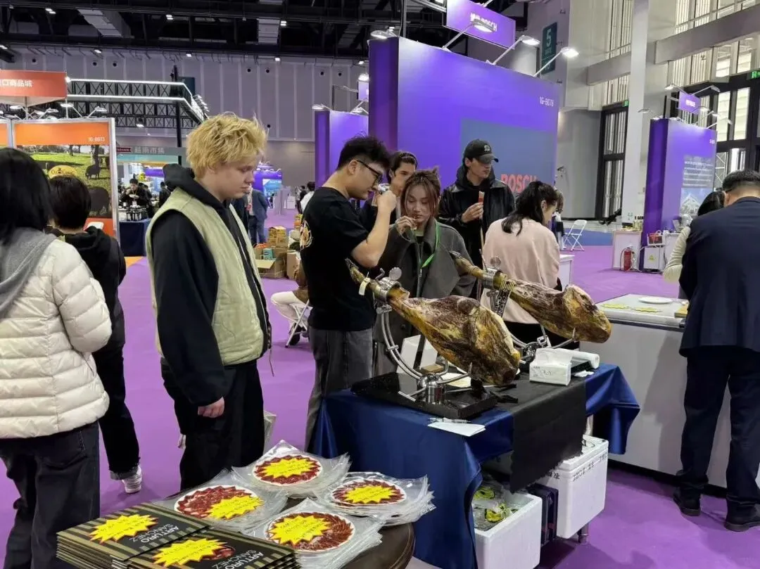ARTURO SÁNCHEZ 火腿是展位的“人气担当”!金黄油润的火腿腿身陈列于展架,专业品鉴师现场展示精湛切片技艺,薄如蝉翼的火腿片纹理清晰,咸香浓郁的风味瞬间征服味蕾。不少经销商、消费者现场下单采购,更有嘉宾专程打卡品鉴,感受百年制腿工艺的极致魅力。