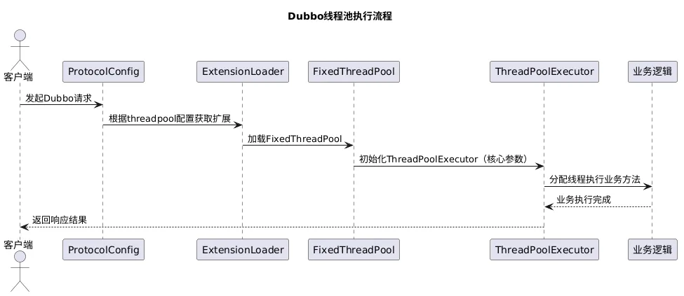 Protocol接口发起Dubbo请求;2.加载线程池扩展:ExtensionLoader根据threadpool配置加载FixedThreadPool;3.初始化线程池:FixedThreadPool创建ThreadPoolExecutor实例;4.分配线程执行任务:ThreadPoolExecutor从线程池或队列中分配线程,执行Invoker的invoke方法(业务逻辑);5.返回响应:业务逻辑执行完成后,线程池将结果返回给客户端。四、线程池参数对服务稳定性的影响