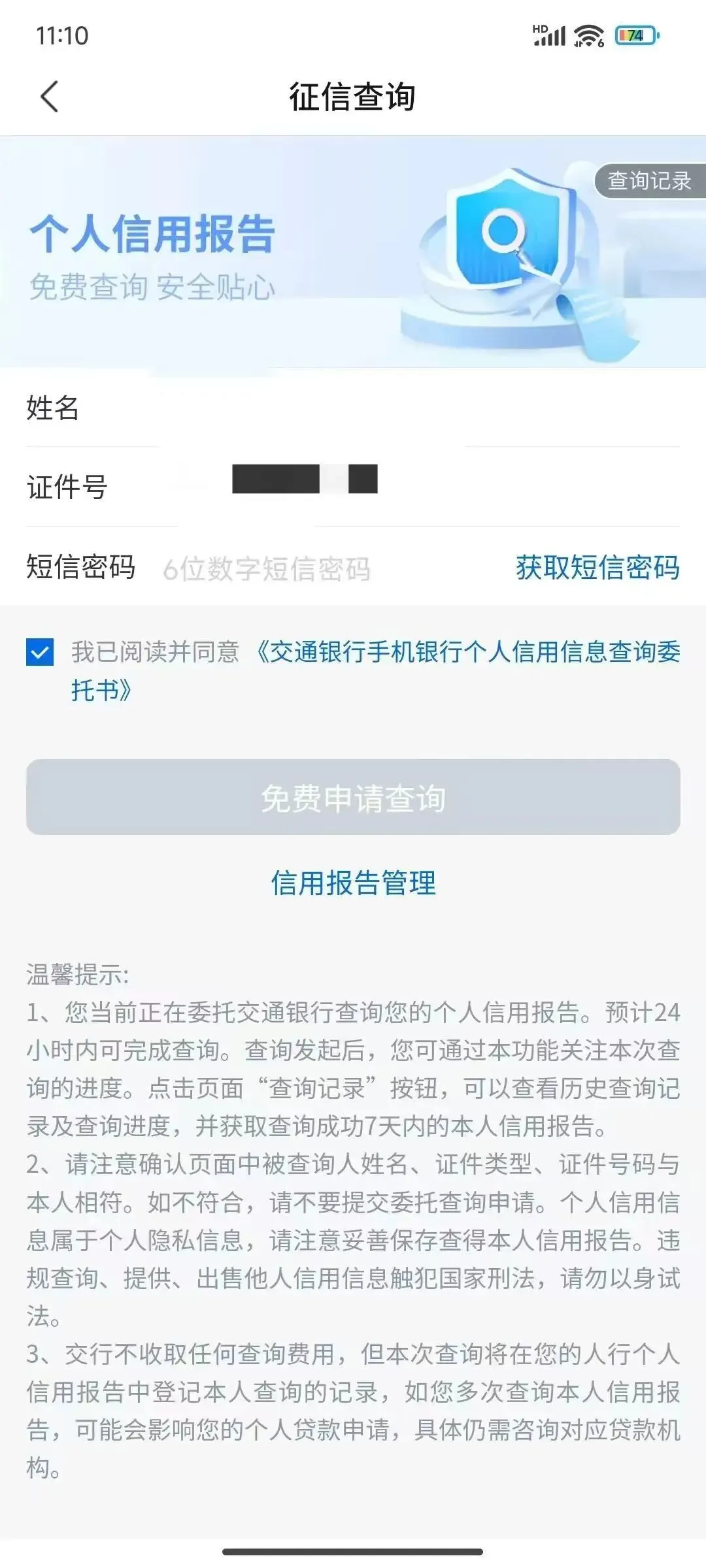本文最后更新于2026-03-16,某些文章具有时效性,若有错误或已失效,请在下方留言或联系老夜。 【交通银行】手机app个人征信,如何在线查询? 建议收藏 1、登录交通银行手机银行。 2、点击上方搜索“征信查询” 3、输入个人信息,查询报告。 分割线 真正的价值,在于当你遇到难题时,我能刚好拿出那个“最优解”。 不想错过每一个与高手同行的机会,如果你也对金融、融资感兴趣,欢迎扫码/搜索添加我的微信,我们慢慢聊。