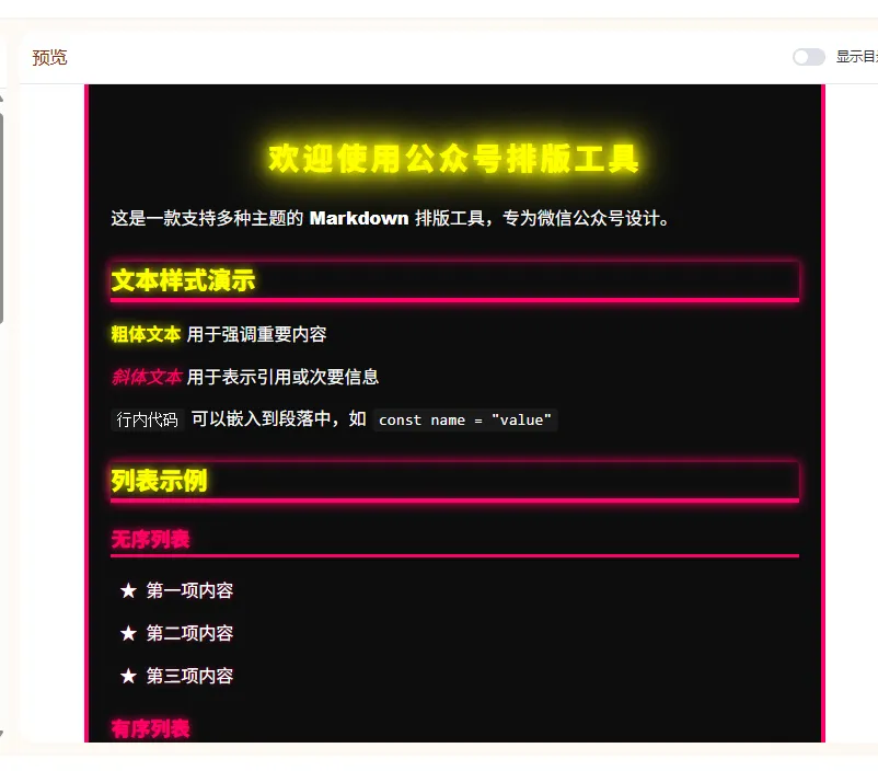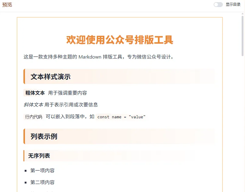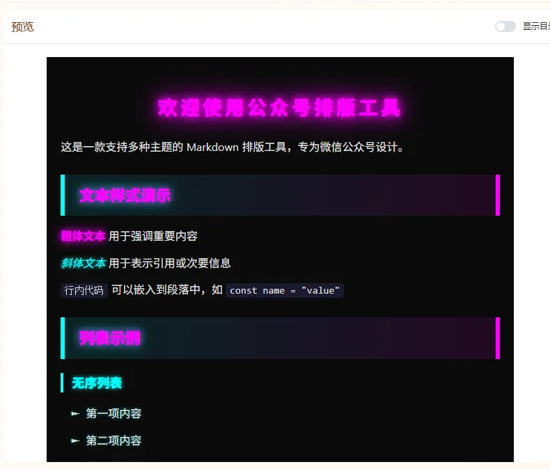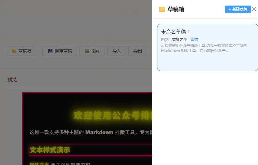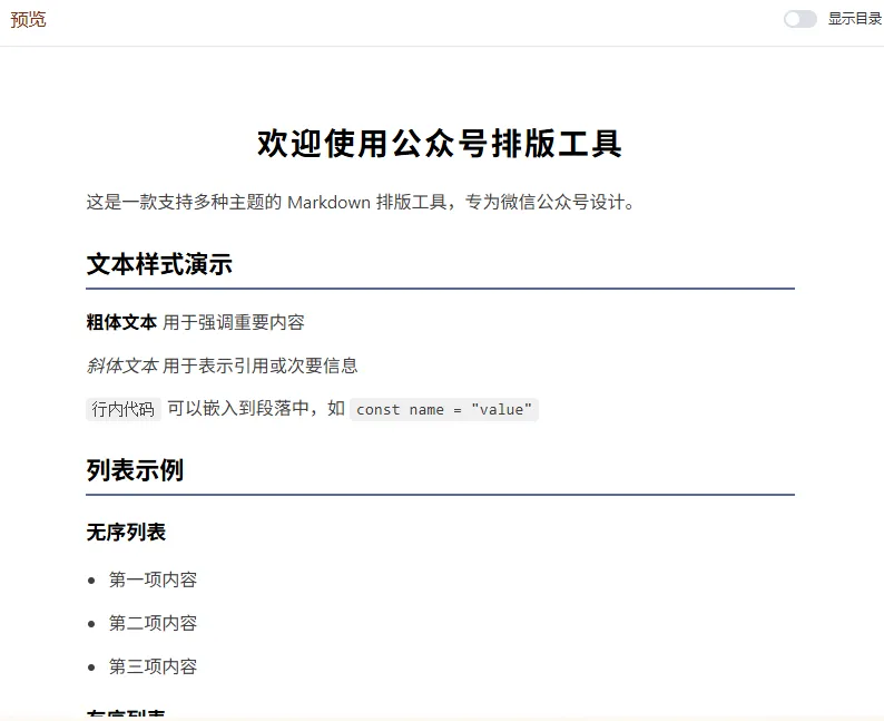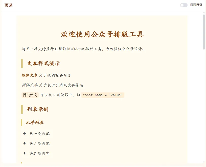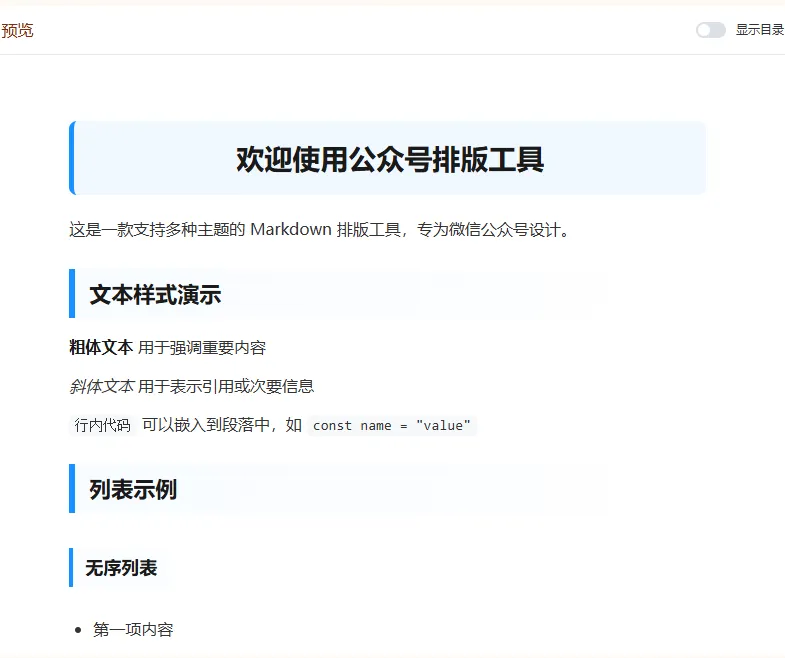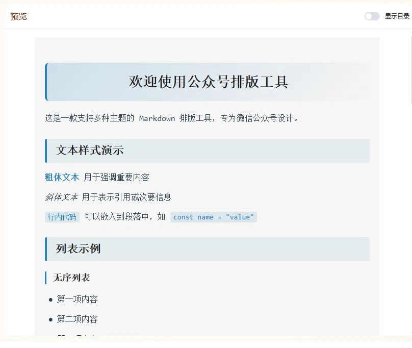 这是一款多主题、可保存多个草稿(草稿保存在本地)、一键复制内容到微信公众号文章、所见即所得的工具,且永久免费使用,无需注册登录的公众号排版工具。