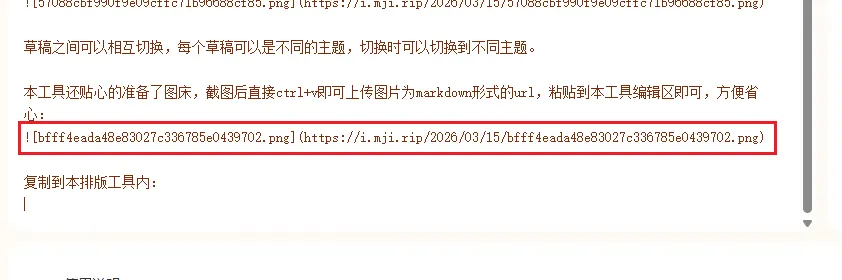 本工具还贴心的准备了图床,截图后直接ctrl+v即可上传图片为markdown形式的url,粘贴到本工具编辑区即可,方便省心: