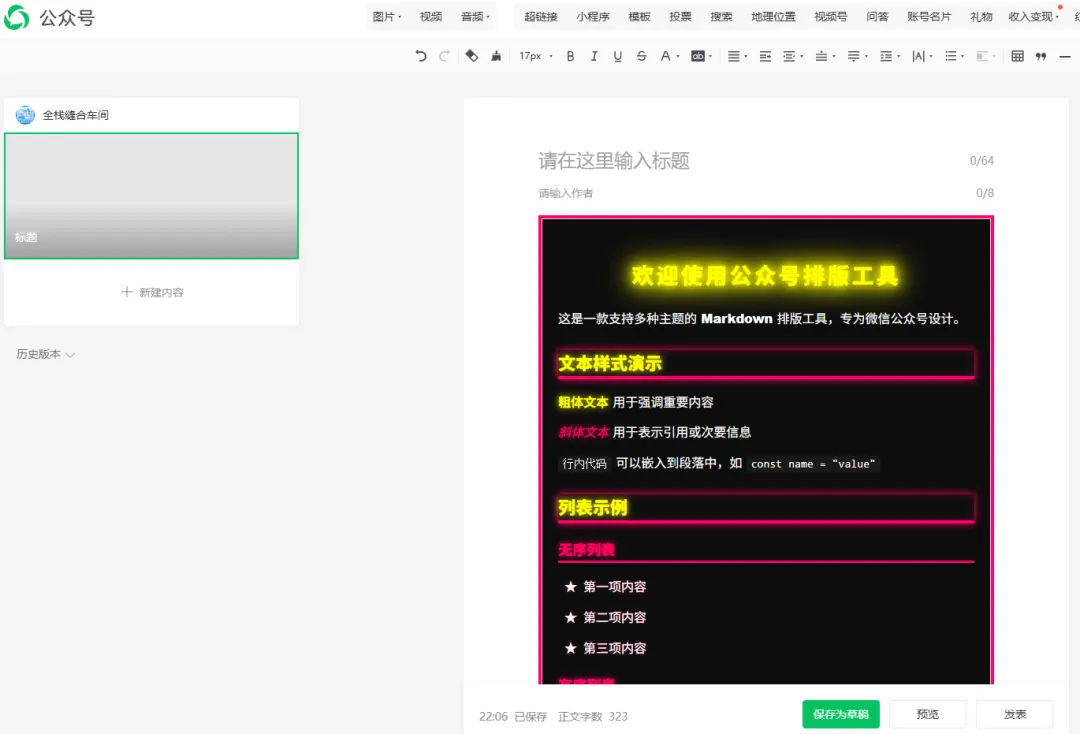 最后就是将写好的文章复制到微信公众号文章编辑页了,是所见即所得的