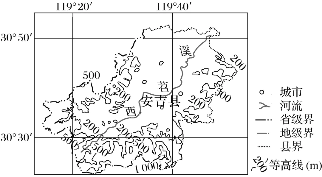 (2024·湖南常德期末)安吉县位于浙江省西北部,县内层峦叠嶂,森林覆盖率达72%,是“绿水青山就是金山银山”思想发源地、中国美丽乡村的典范。20世纪80年代,为摘掉“落后县”的帽子,安吉县走工业强县之路,环境污染加剧。面对困境,安吉县变生态优势为经济优势,逐步探索出一条“生态美、产业兴、百姓富”的发展路子,真正实现了从“绿水青山”向“金山银山”的转变。下图为“安吉县等高线地形图”。据此完成4~5题。
