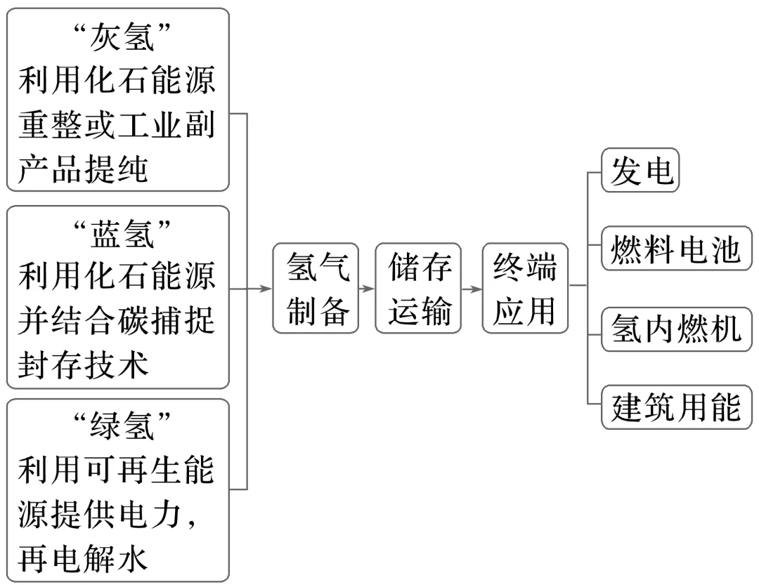 (2022·辽宁地理)张家口地区的东南部为山间盆地,地势相对平坦,水资源丰富。该地区利用充沛的风能、太阳能资源,建设了绿氢生产基地。下图为“氢能产业链示意图”。据此完成13~14题。